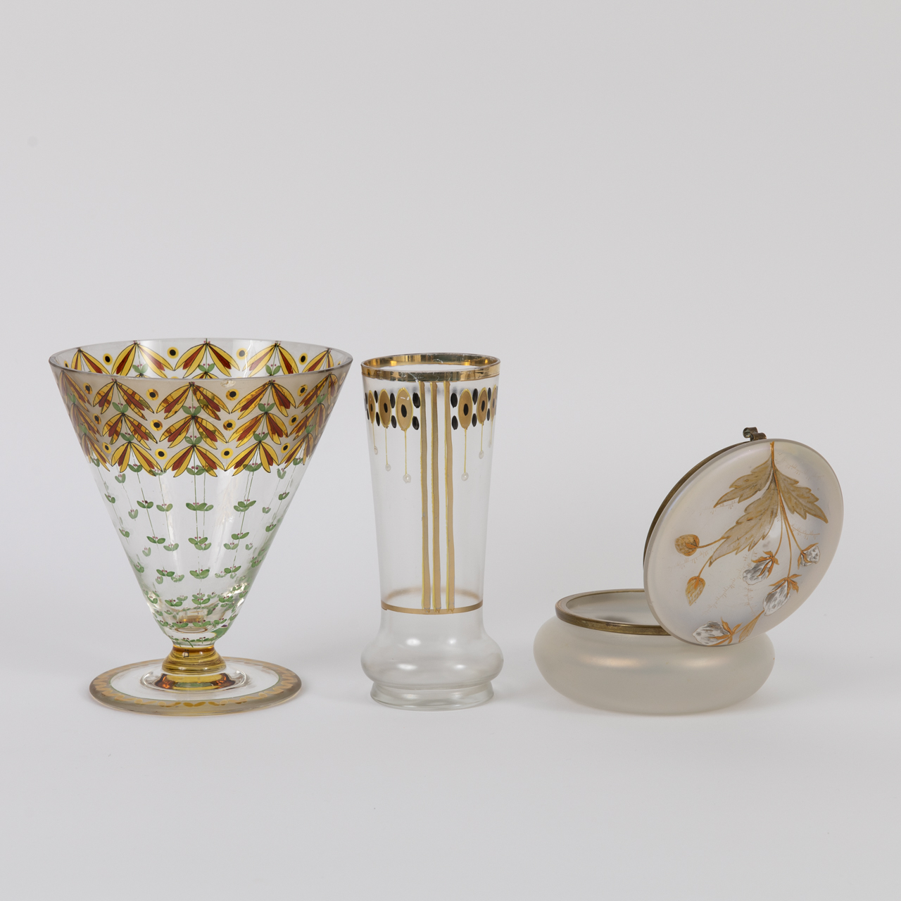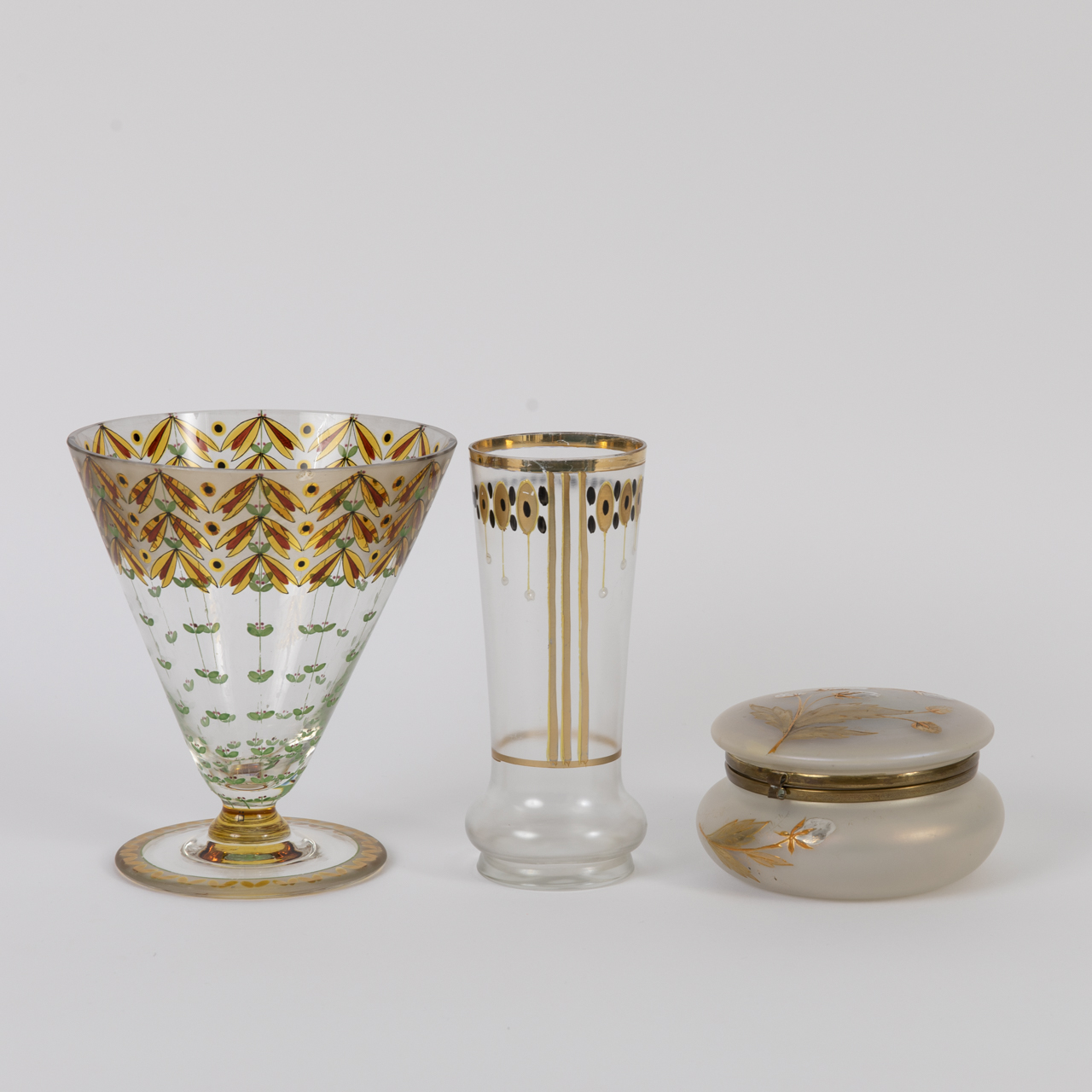 Dreiteiliges Konvolut bestehend aus: 1) Deckeldose aus opakem, irisierendem Glas mit gedrückt kugeliger Wandung und Zinnmontur, auf der Schauseite und dem Deckel mit feiner floraler Emailmalerei bzw. Reliefemail, goldstaffiert; im Deckel nummeriert; Höhe: ca. 7 cm. 2) Kleine Vase aus mattiertem Klarglas mit zylindrischer Wandung auf gedrückt kugeligem Schaft mit umlaufender Goldmalerei (matt und glänzend) mit schwarzen Tupfen und opakweißen Reliefemail-Tropfen (?); Höhe: ca. 16,4 cm. 3) Fußvase mit zylindrischem Korpus, eingezogenem Nodus auf scheibenförmigem Stand mit geometrisch-floraler Emailmalerei in Eisenrot-, Gelb- und Grüntönen; im gelben Nodus Signet der Glasfachschule Haida und Johann Oertel & Co.; Chip von ca. 8 mm am Lippenrand; Höhe: ca. 17 cm. Alle Teile in altersbedingtem Gebrauchszustand mit entsprechenden Gebrauchsspuren und partiellem Goldabrieb; Gesamtgewicht: ca. 989 g.