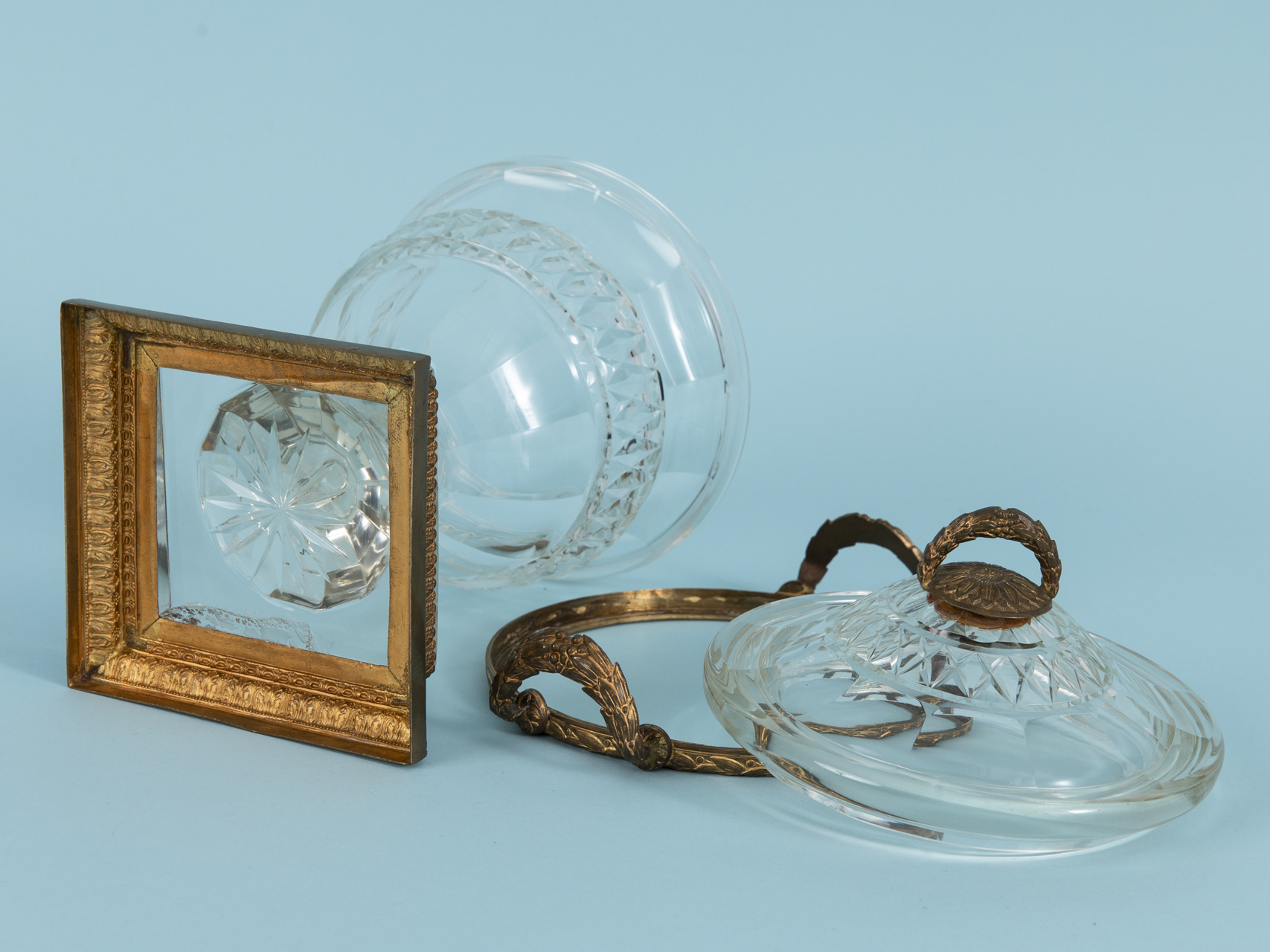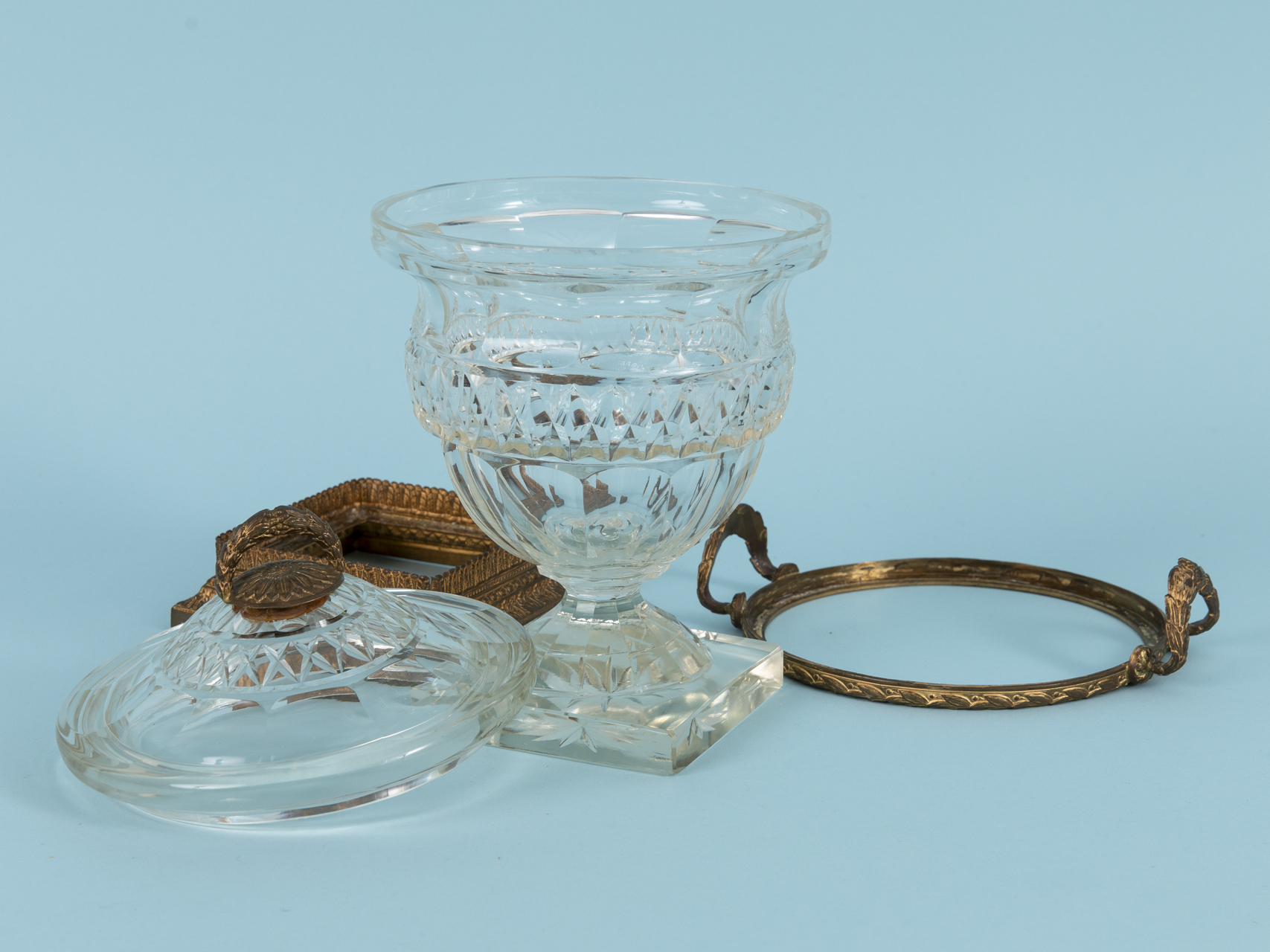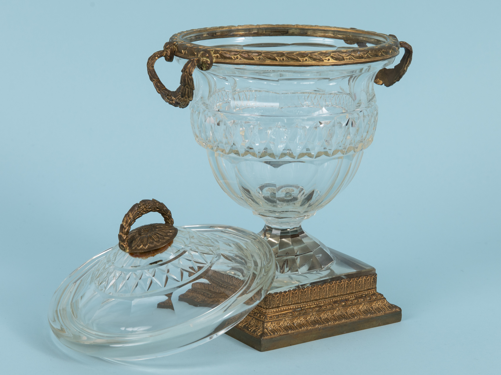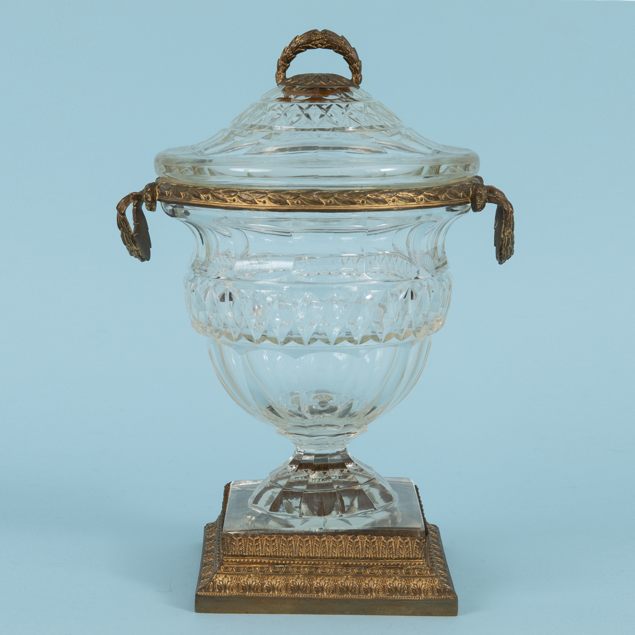 Crystal glass and gold-coloured brass bronze; cup with ovoid body, waisted stem and round foot transitioning into a square plinth, with encircling cut decoration in various ornamental patterns; stepped plinth and rim with handles on both sides in diverse ornamental and floral designs made of brass bronze; removable lid with finial in floral and festoon decoration, made of brass bronze; brass mounts to the body removable; underside of the plinth restored over approx. 5.5 cm; age-related signs of wear; height: approx. 23.3 cm; weight: approx. 1.2 kg.
