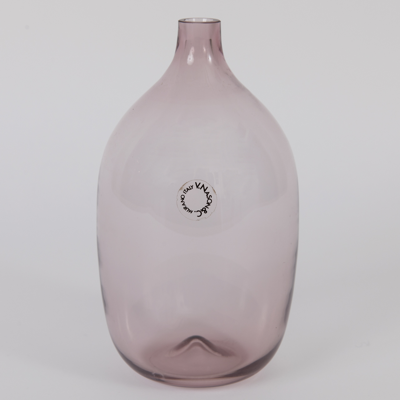 Delicate rosé-coloured Murano glass with indented base; good used condition with light deposits inside and tiny chips on the rim; height: approx. 18 cm; original label on the wall, signature “V Nason” on the base; weight: approx. 250 g.