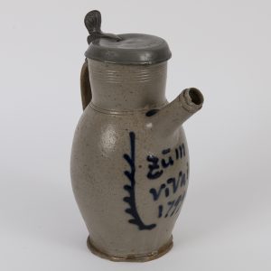 Stoneware, salt-glazed with cobalt-blue decoration; jug with handle, slightly bulbous wall, high-set spout and ear-shaped handle, circumferential incised décor on the neck, hinged pewter lid at the back with thumb rest and engraved inscription “-Ch-SIM”; on the front, around the spout, a cobalt-blue reserve with the maxim “zum Vivat 1799”; spout repaired in several places, chips on the base and deformations in the pewter; height: approx. 26.2 cm; weight: approx. 1045 g.