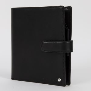Calf leather, full-grain, matt waxed; stamped “MONTBLANC” inside and outside, with Montblanc emblem on the exterior; inside with 6 rings, 4 credit card slots, 1 elongated compartment, 1 zippered compartment, 1 pen holder; including calendar insert 2004, originally sealed; dimensions: approx. 12.5 × 14 cm; very good condition; weight of organizer: 182 g; total weight: approx. 242 g.