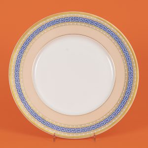 White porcelain with continuous blue meander band, pink ground decoration, gilt rim and fine gilt painting on white ground; classical plate shape with wide rim, decorated and set off with fine gilt border towards the well; probably 2nd quality and in good condition with minimal signs of use; diameter: approx. 27 cm; underside with earlier blue sceptre mark, red orb (this one with underline) and black numerals (painter’s mark?); weight: approx. 815 g.