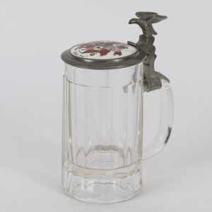 Glass with enamel décor and pewter mount; tankard with lobed, conical body, centrally attached C-handle and hinged lid with thumb rest in the form of a stylised eagle; pewter lid mount with white porcelain insert depicting the coat of arms of a historical Stuttgart student fraternity (presumably dissolved and unassigned today) with the surrounding inscriptions “Hütte sei’s Panier!” and “Glück auf!”; inner side inscribed: “E. Wandel”, interlaced monogram “FH”, “s/l E. Beines” (same interlaced monogram), “z. frndl. Erg. W.S. 1909/10 R. Frank Stuttgart”; inscribed “6/20 G” on the rim; faceted foot ring; age-related signs of wear, crack to the lid mount; height: approx. 18.2 cm; weight: approx. 967 g.