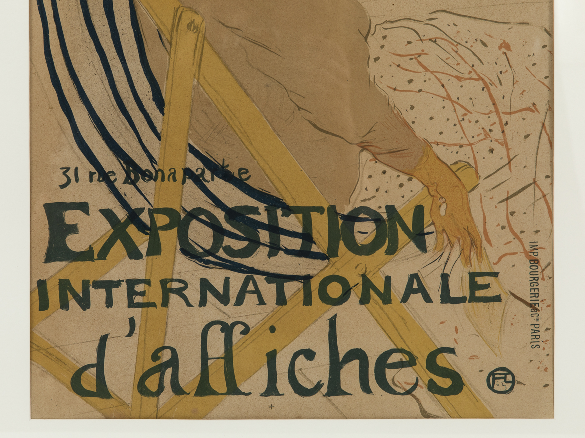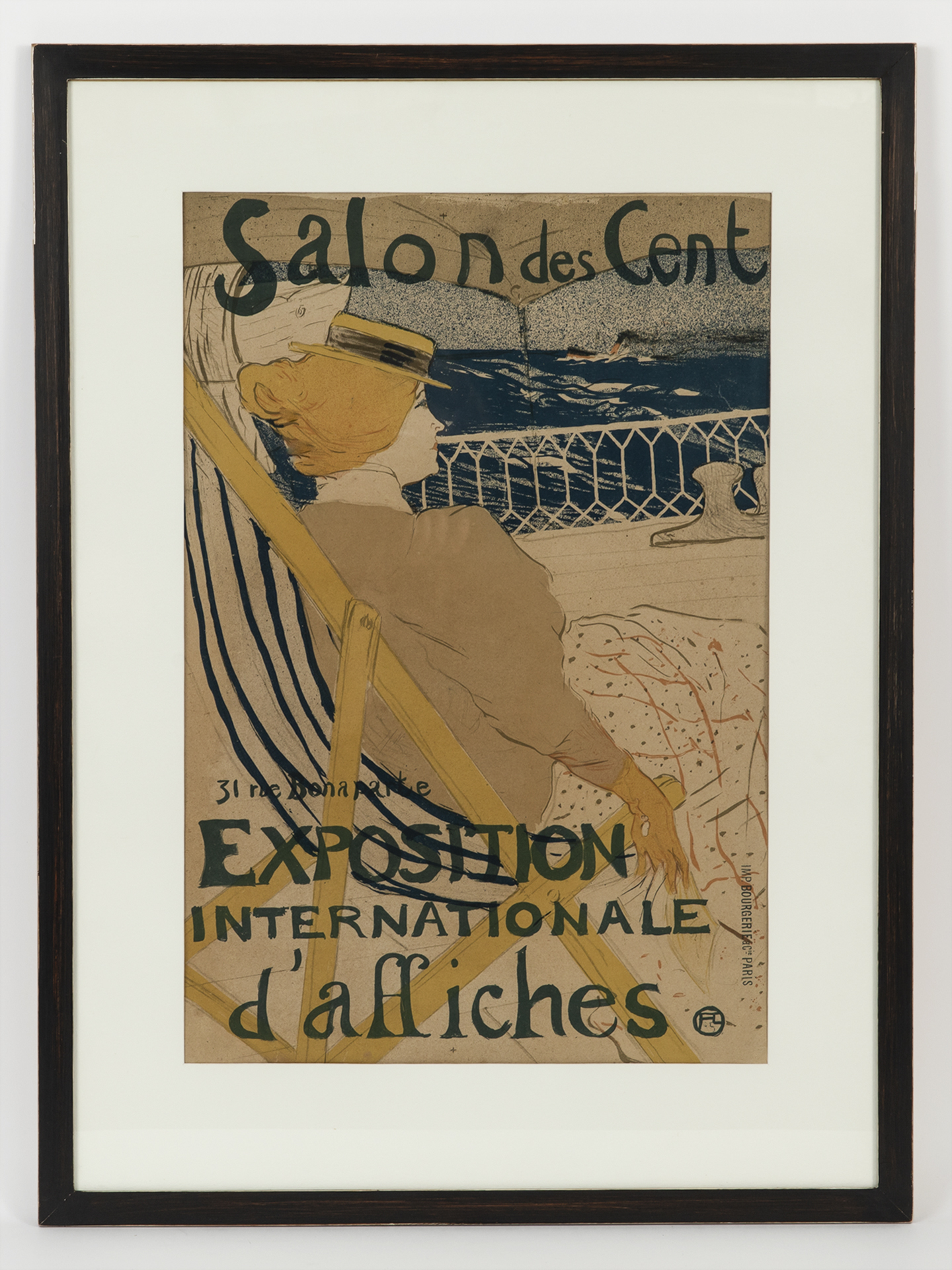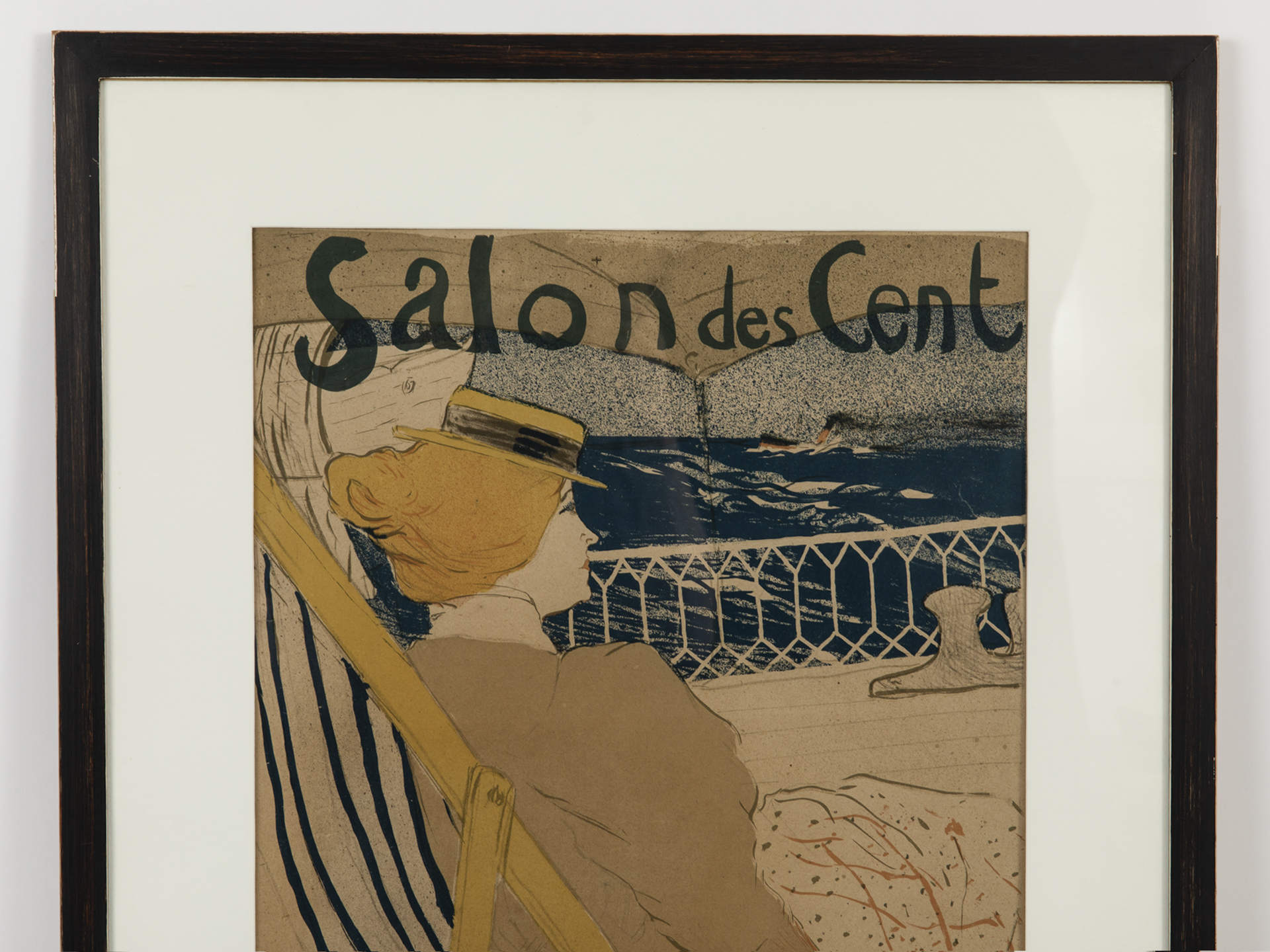 Polychrome Platten- bzw. Steinlithographie auf Papier; „Salon des cent“ aus 1896; Plakat im Art-Nouveau-Stil in komplementären, gedämpften Farben; Abbildung der Silhouette einer Dame, die der Künstler auf der Überfahrt von Le Havre nach Bordeaux traf, in aufwendiger Robe mit Handschuhen und Hut bekleidet, in einem Sonnenstuhl an Deck des Schiffes sitzend und auf das offene Meer blickend, auf dem ein Schiff in der Ferne vorbeizieht; das Plakat wurde für die Ausstellung im 'Salon des Cent' gedruckt, die von Oktober 1895 bis März 1896 stattfand, die Eckdaten sind auf dem Plakat vermerkt; seitlich rechts mit Stempel der Druckerei Bourgerie et Cie in Paris und unten rechts mit Künstlermonogramm versehen; weißes Passepartout; moderner schwarzer Holzrahmen mit diversen Verunreinigungen und Abplatzungen; hinter Glas; nicht geöffnet; altersbedingte Gebrauchsspuren; Bildausschnittmaße: ca. 58,5 x 39 cm; Rahmenmaße: ca. 79,5 x 58,5 cm; Gewicht: ca. 3,3 kg.