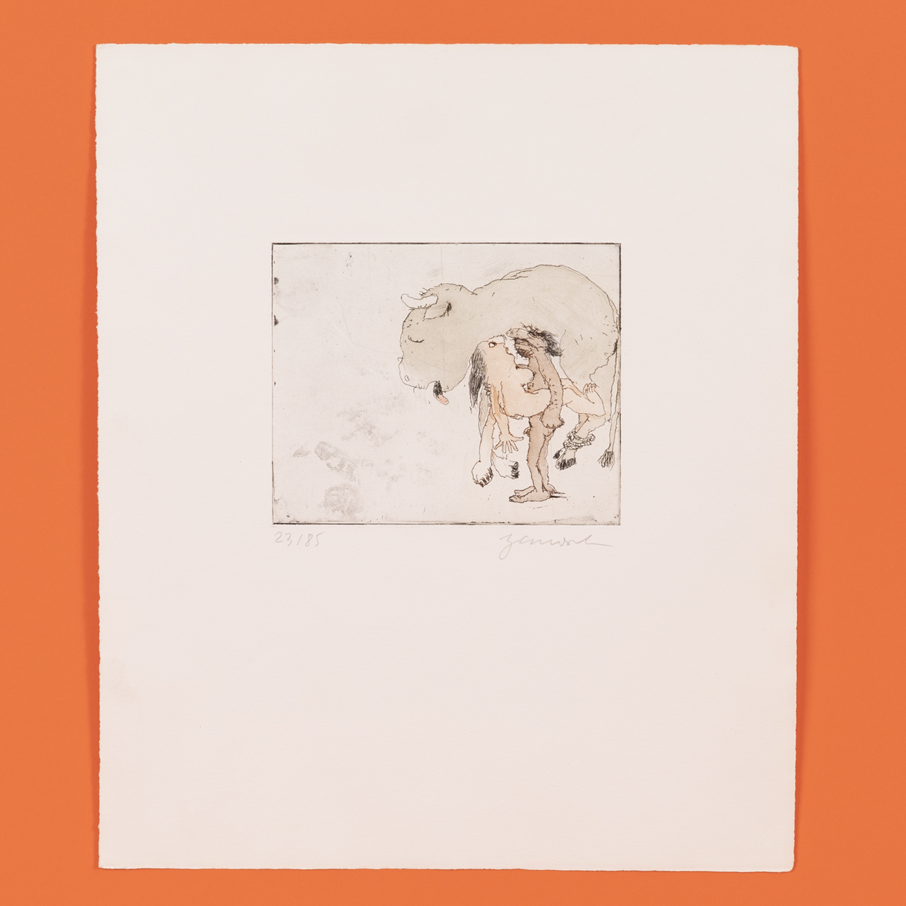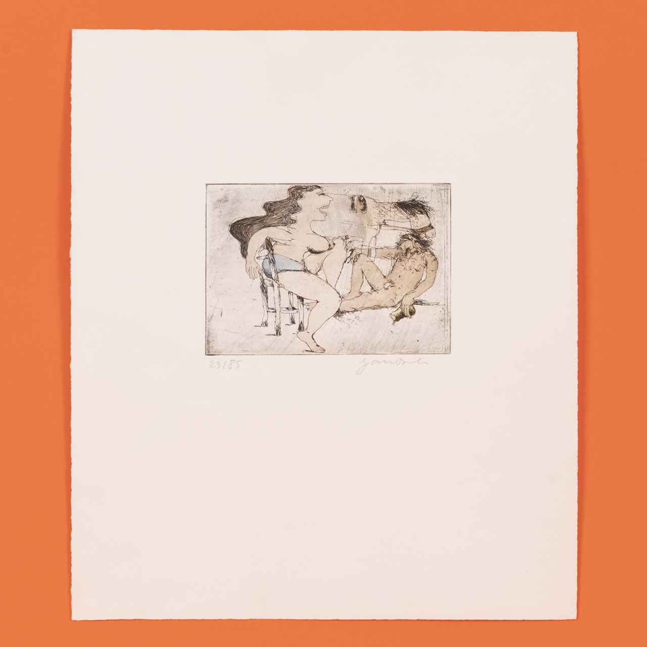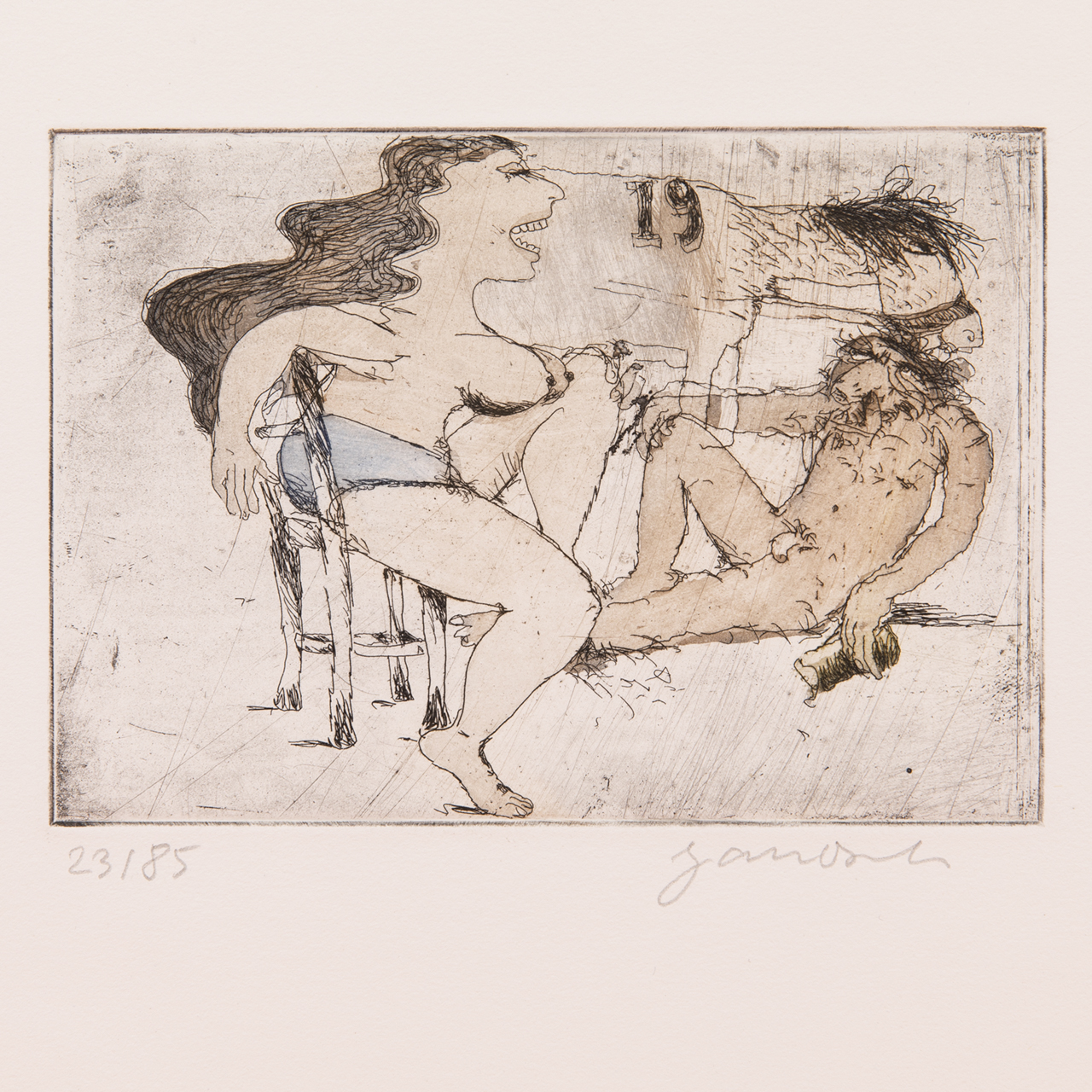 Three coloured etchings on wove paper; various erotic caricatures; all numbered lower left “23/85” and signed lower right; very good condition consistent with age; plate dimensions: approx. 15.3 x 11 cm, 13 x 16 cm and 11 x 15.5 cm; sheet dimensions: approx. 38 x 32 cm.