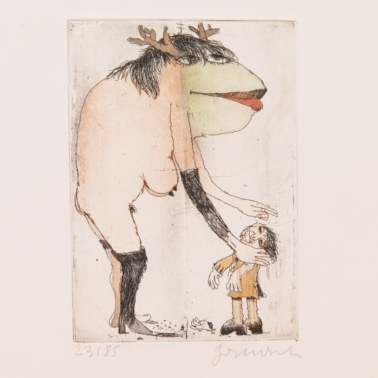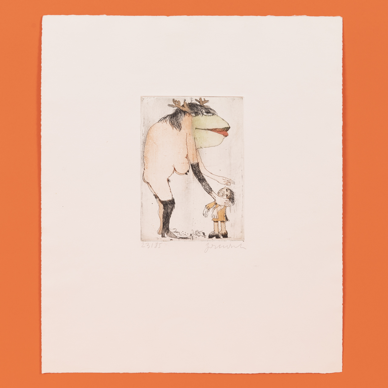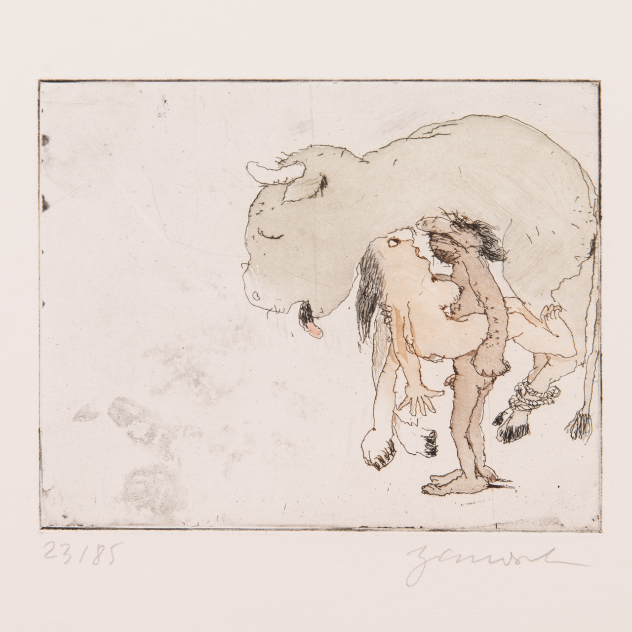 Three coloured etchings on wove paper; various erotic caricatures; all numbered lower left “23/85” and signed lower right; very good condition consistent with age; plate dimensions: approx. 15.3 x 11 cm, 13 x 16 cm and 11 x 15.5 cm; sheet dimensions: approx. 38 x 32 cm.