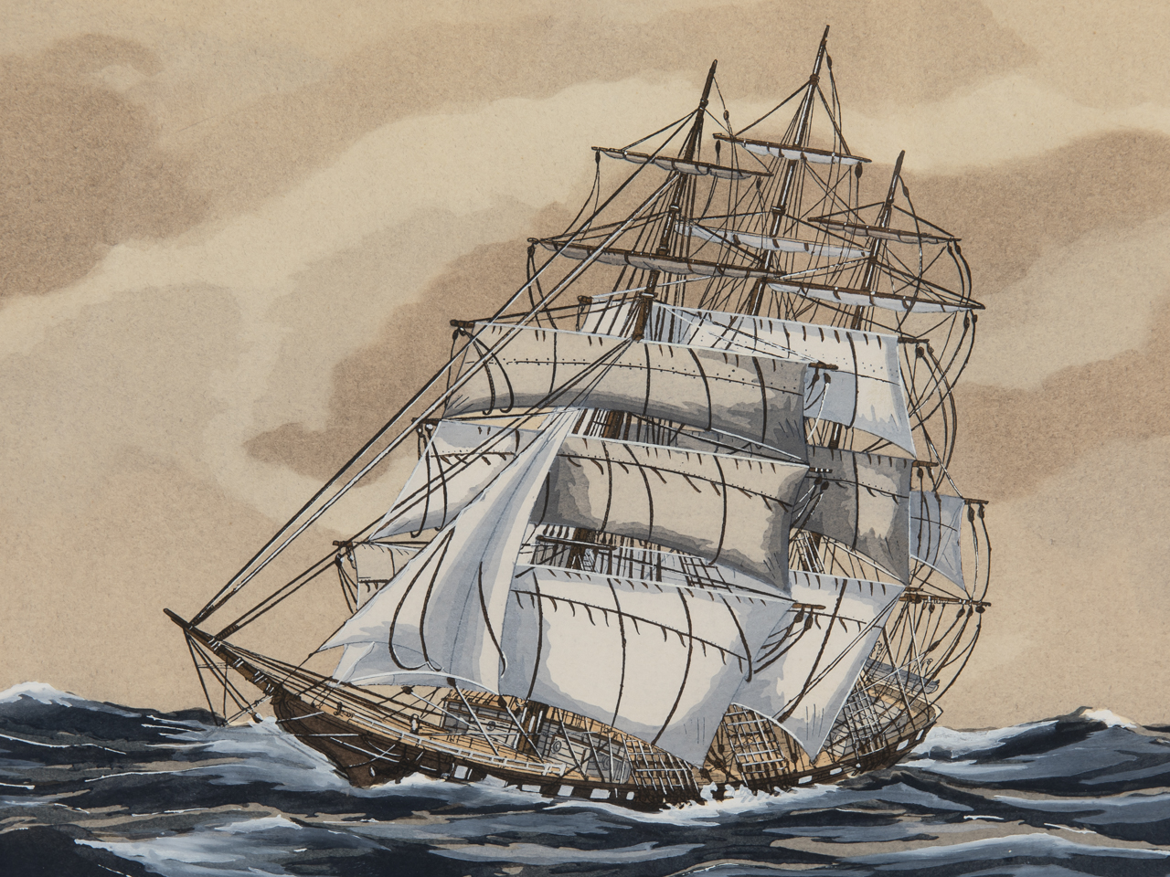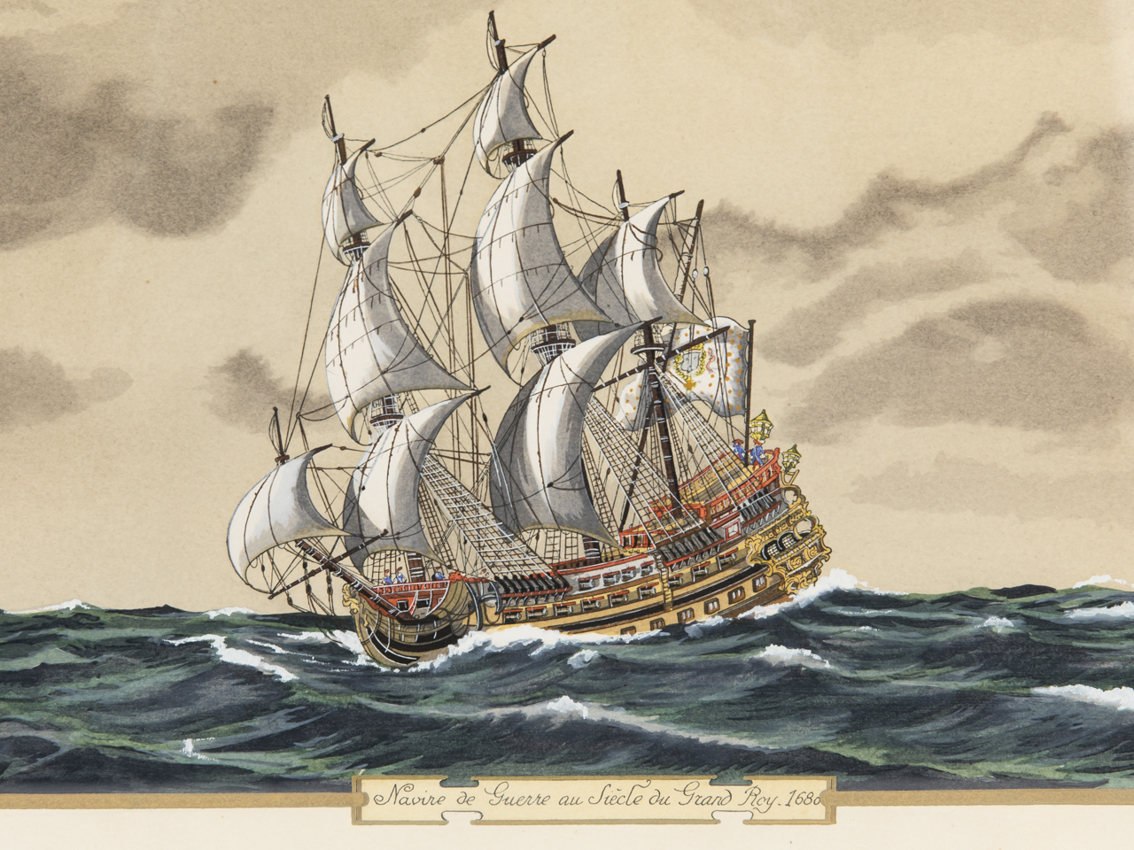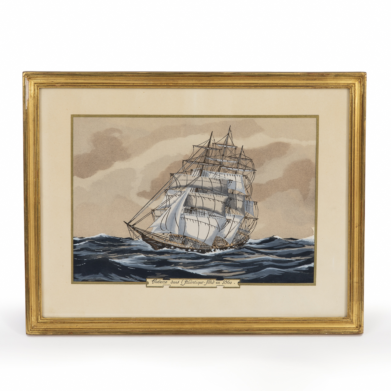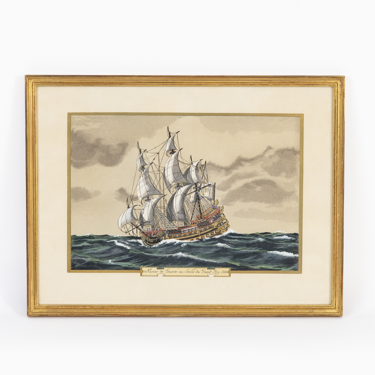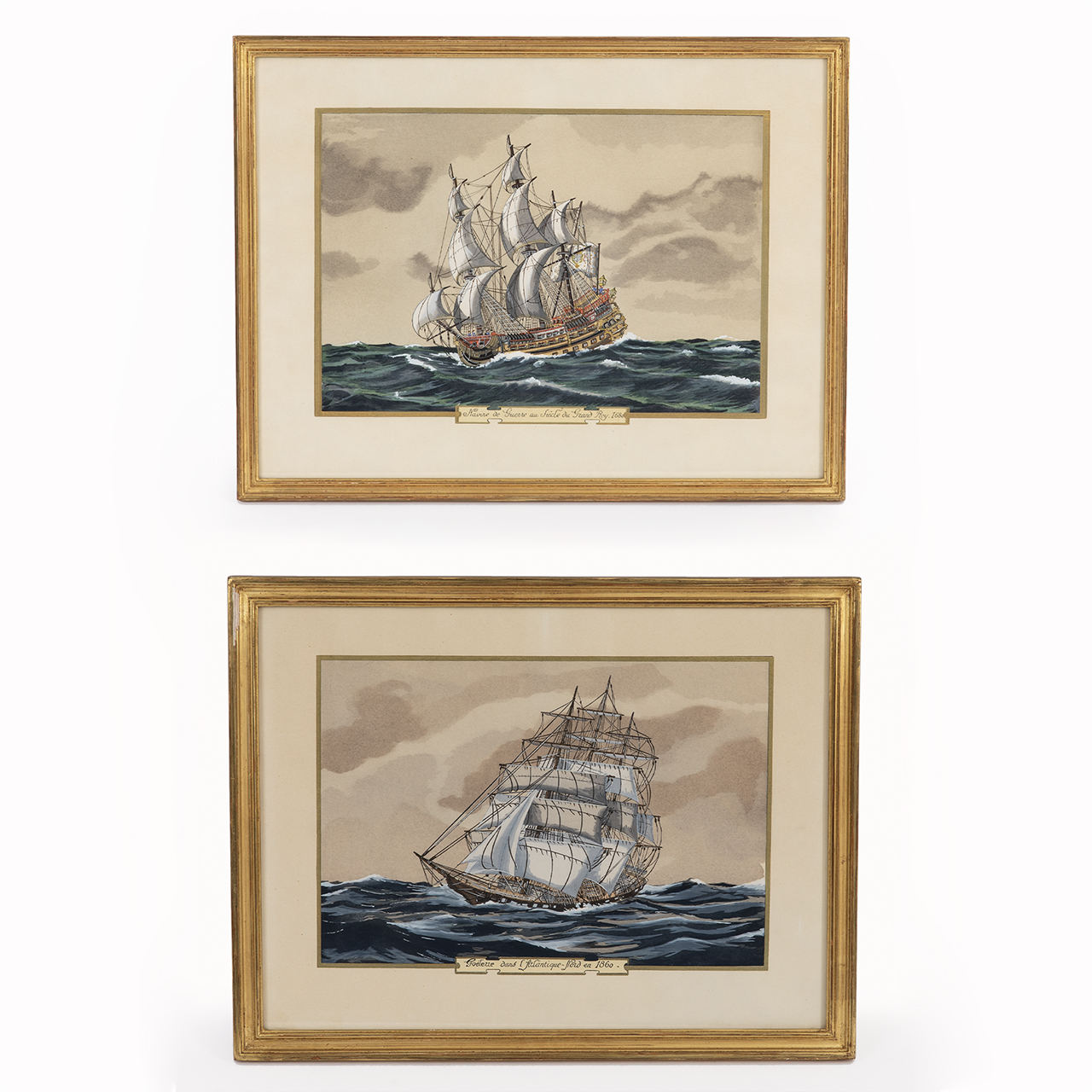 Zwei Farblithographien, weiß gehöht und goldfarbig umrandet auf Papier; Marinemalerei; zwei Abbildungen historisierender Großsegler-Motive auf hoher See (jeweils unten in französischer Sprache bezeichnet „Goélette dans l'Atlantique-Nord en 1860“ und „Navire de Guerre au Siècle du Grand Roy. 1680“); chamoisfarbenes Passepartout; schmale goldfarbene Rahmen; nicht geöffnet; Bildmaße: je ca. 21 x 30,5 cm; Rahmenmaße: ca. 33 x 43 cm und 32 x 42 cm; Gesamtgewicht: ca. 1,85 kg.