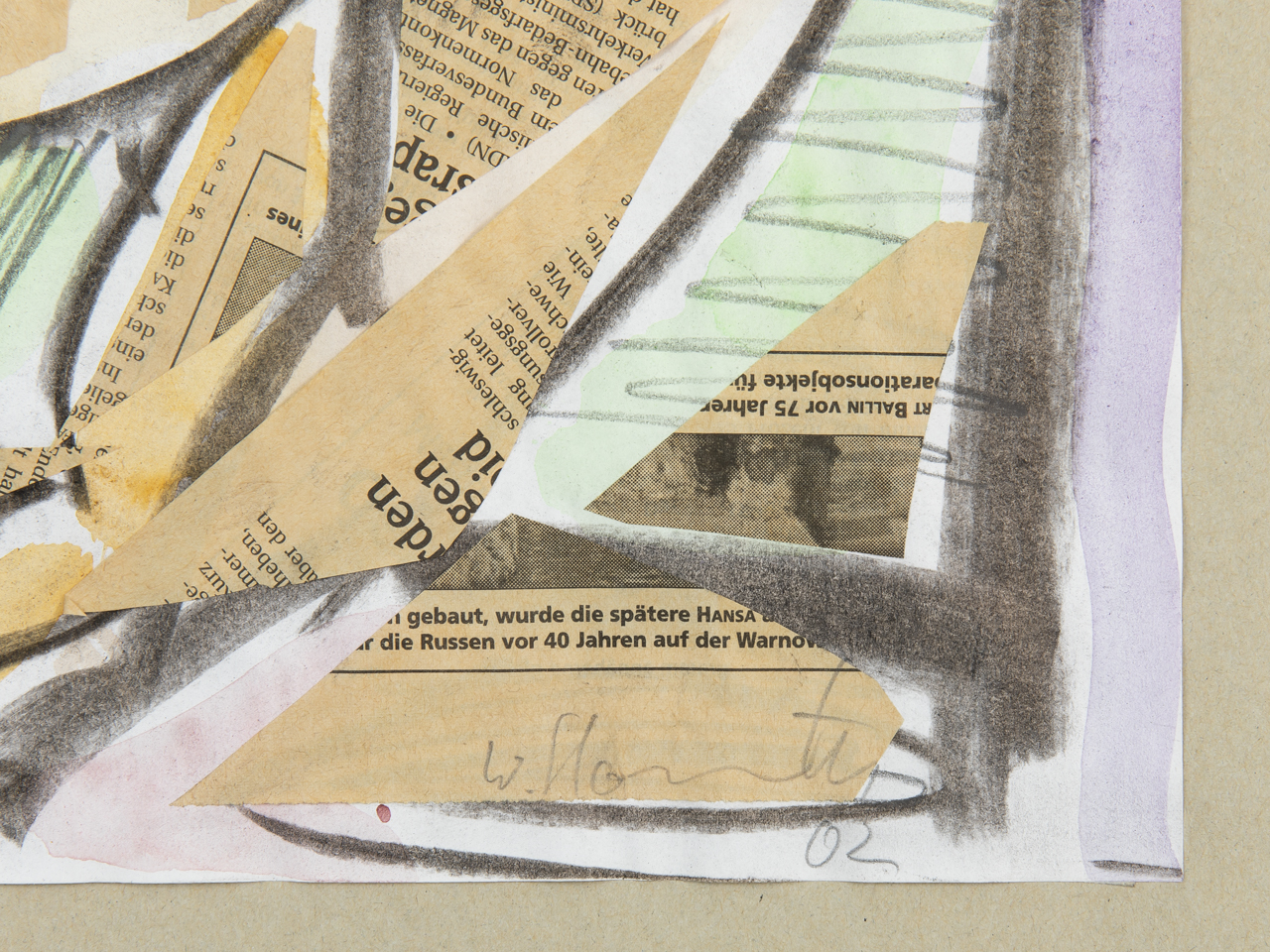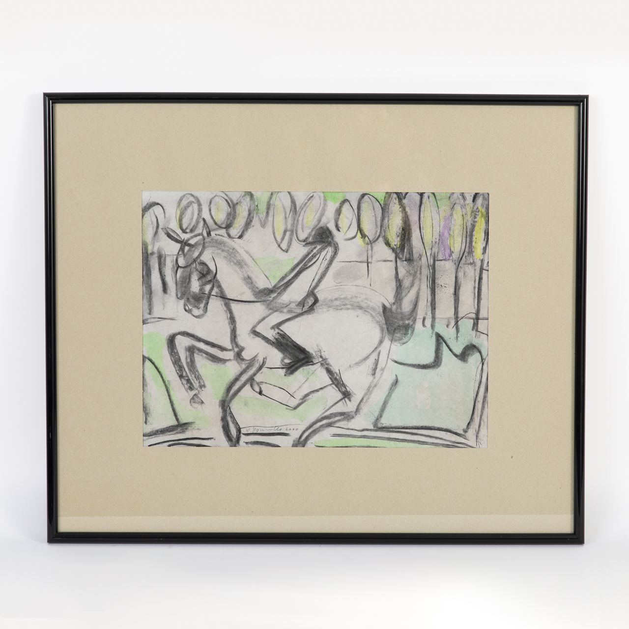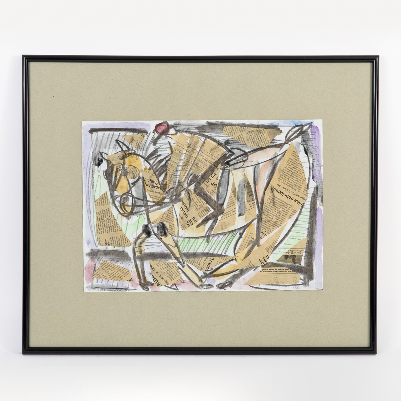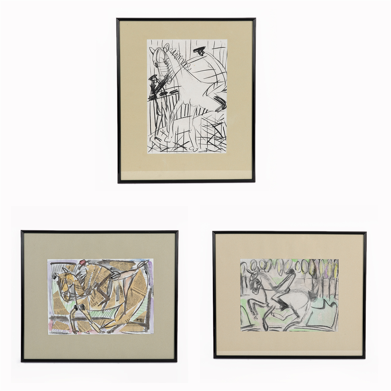 3 polychrome collages, consisting of a mixed media on paper with an abstract depiction of a jockey on his horse leaning slightly forward, signed and dated lower left and lower right "W. Homuth 02", a charcoal drawing on sketching paper with an abstract, monochrome depiction of a dressage rider in an arena on a horse being held at the head by another person, signed and dated in the center below "Homuth 2000", and a work in chalk, pencil and watercolours on parchment paper with an abstract depiction of a dressage rider on his galloping horse in a field in front of a row of closely standing trees, with visible work traces, signed and dated lower left "W. Homuth 2000". All with beige Passepartout, modern narrow black plastic frame, under glass, not opened; image section dimensions: ca. 29 x 38.6 cm; frame dimensions: ca. 51.3 x 61 cm; total weight: ca. 8.4 kg.