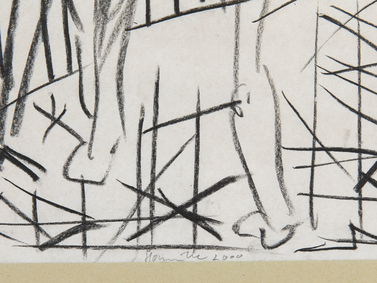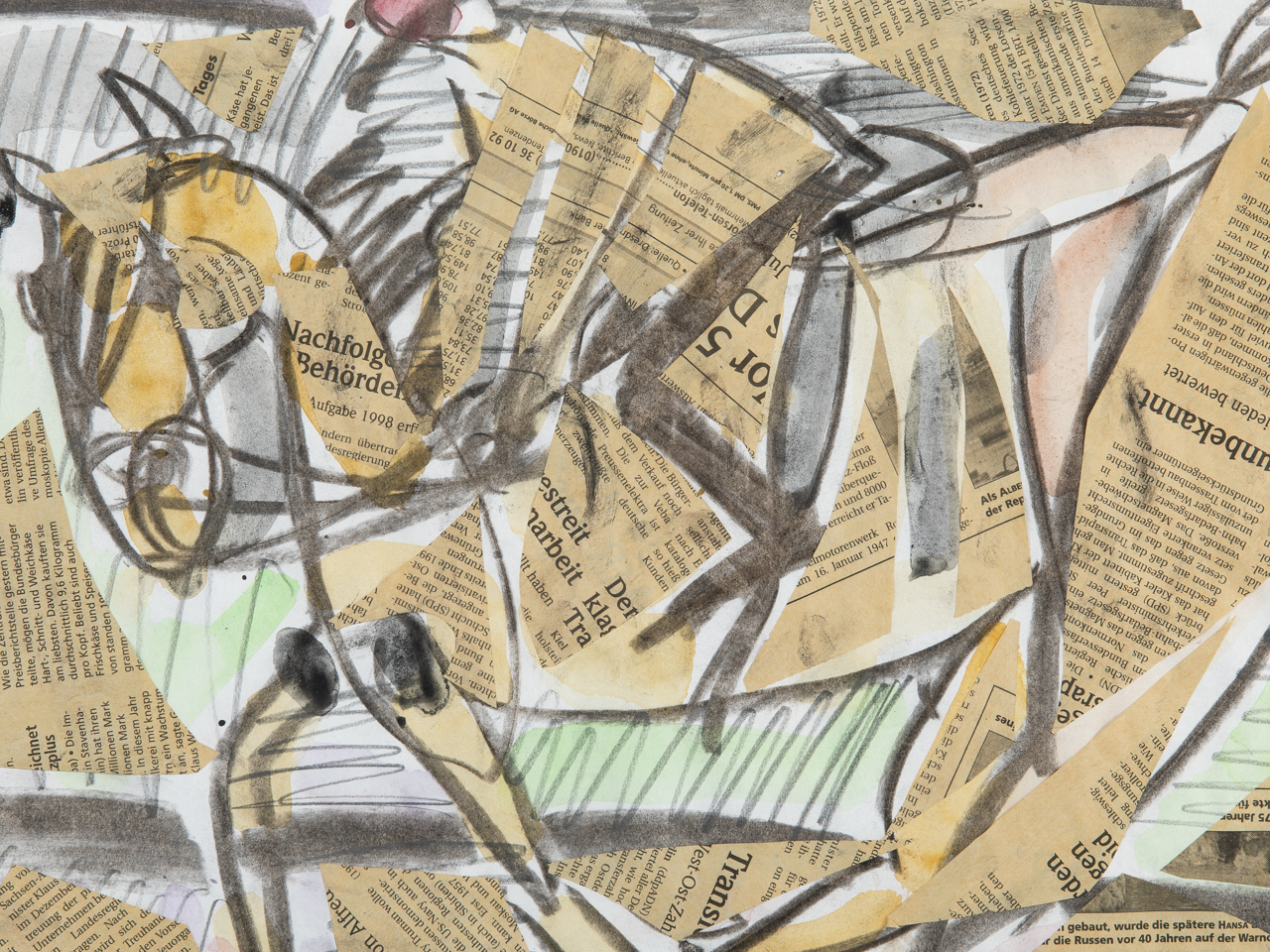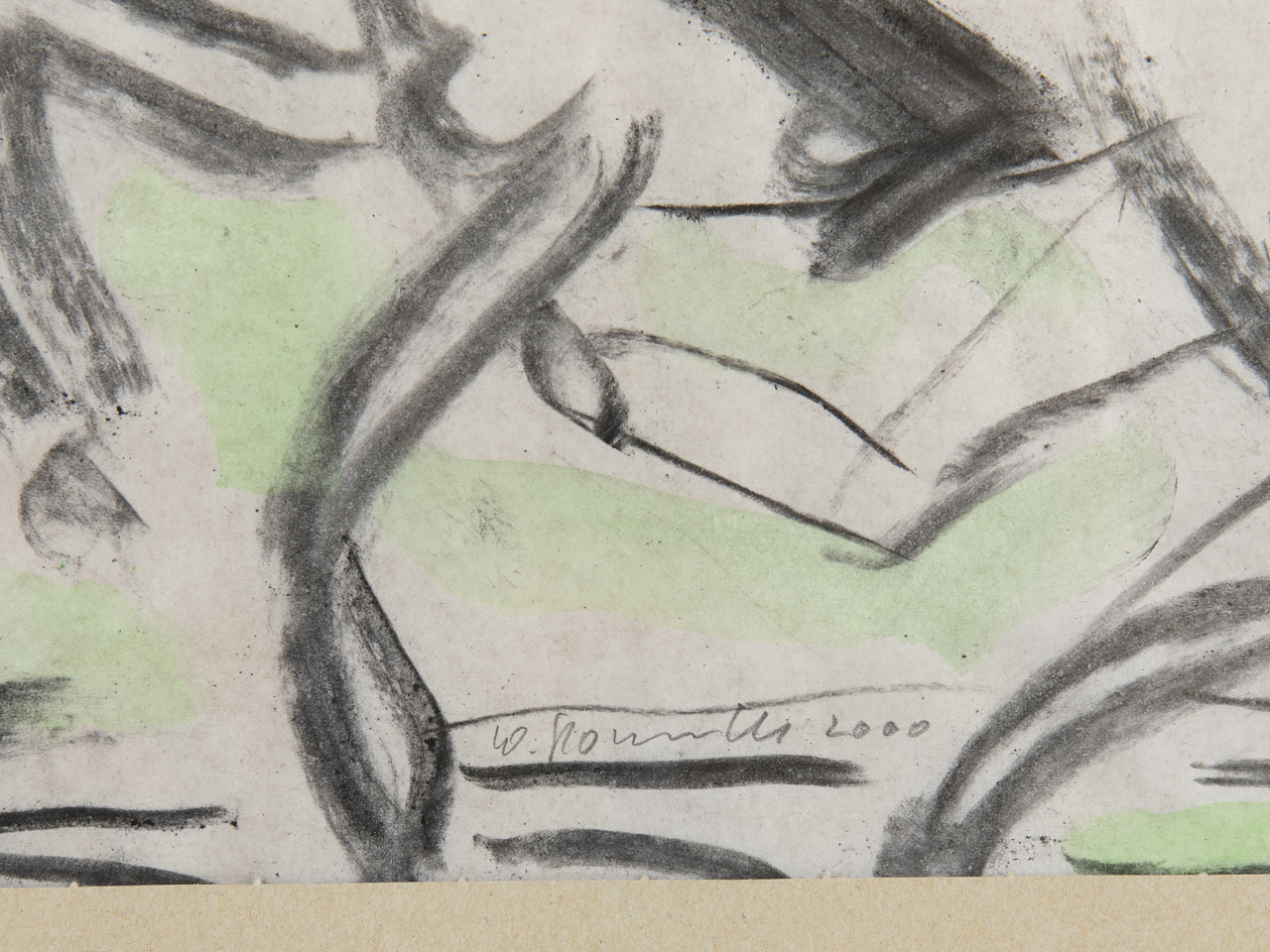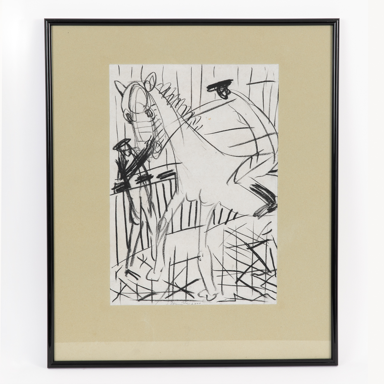 3 polychrome collages, consisting of a mixed media on paper with an abstract depiction of a jockey on his horse leaning slightly forward, signed and dated lower left and lower right "W. Homuth 02", a charcoal drawing on sketching paper with an abstract, monochrome depiction of a dressage rider in an arena on a horse being held at the head by another person, signed and dated in the center below "Homuth 2000", and a work in chalk, pencil and watercolours on parchment paper with an abstract depiction of a dressage rider on his galloping horse in a field in front of a row of closely standing trees, with visible work traces, signed and dated lower left "W. Homuth 2000". All with beige Passepartout, modern narrow black plastic frame, under glass, not opened; image section dimensions: ca. 29 x 38.6 cm; frame dimensions: ca. 51.3 x 61 cm; total weight: ca. 8.4 kg.