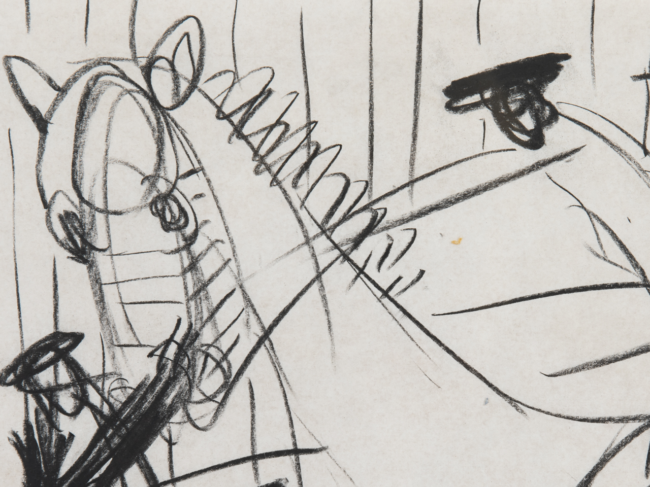 3 polychrome Collagen; 1) Mischtechnik auf Papier; Abstrakte Darstellung eines Jokeys auf seinem leicht nach vorne gebeugtem Pferd; unten links und unten rechts signiert und datiert "W. Homuth 02". 2) Kohle auf Skizzenpapier; Abstrakte, monochrome Zeichnung; Darstellung eines sich in einer Manege befindlichen Dressurreiters auf einem Pferd, welches von einer weiteren Person am Kopf gehalten wird; unten mittig signiert und datiert "Homuth 2000". 3) Kreide, Bleistift und Aquarellfarben auf Pergamentpapier; Abstrakte Darstellung eines Dressurreiters auf seinem galoppierenden Pferd in einem Feld vor einer Reihe eng aneinander stehender Bäume; sichtbare Werkspuren; unten links signiert und datiert "W. Homuth 2000". Alle mit beigefarbenem Passepartout; moderner, schwarzer, schmaler Kunststoffrahmen; hinter Glas; nicht geöffnet; Bildausschnittmaße: ca. 29 cm x 38,6 cm; Rahmenmaße: ca. 51,3 cm x 61 cm; Gesamtgewicht: ca. 8,4 Kg.