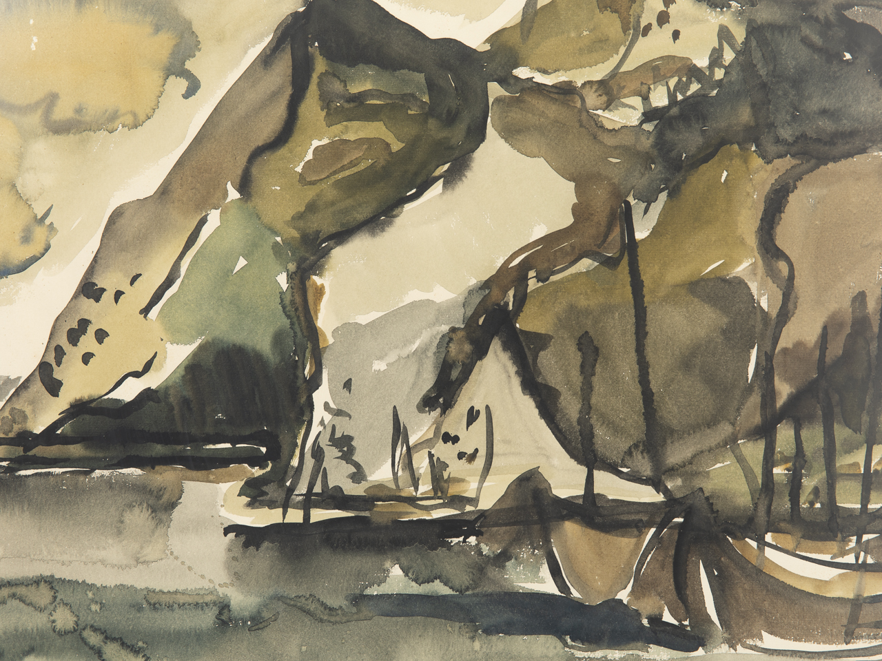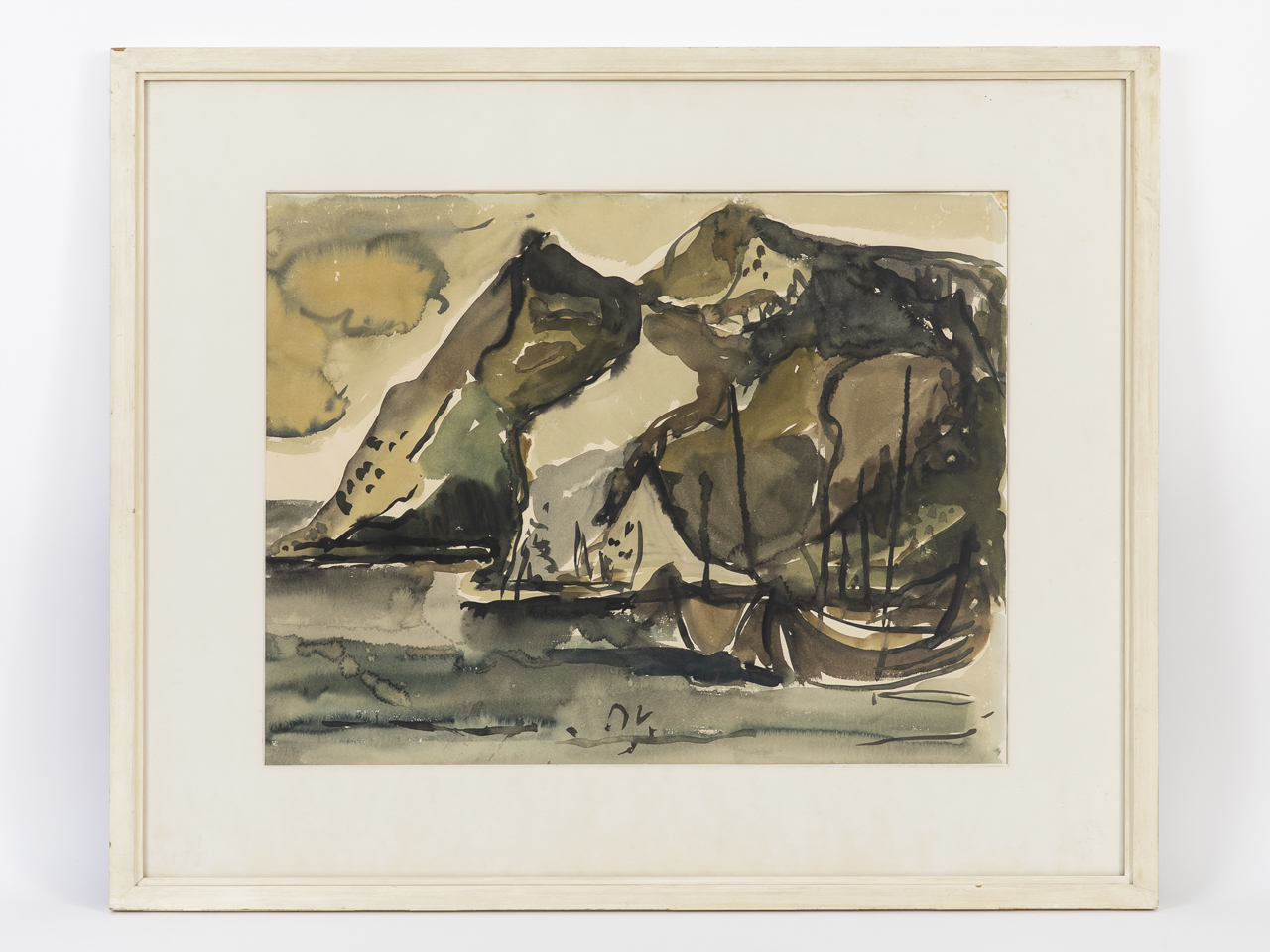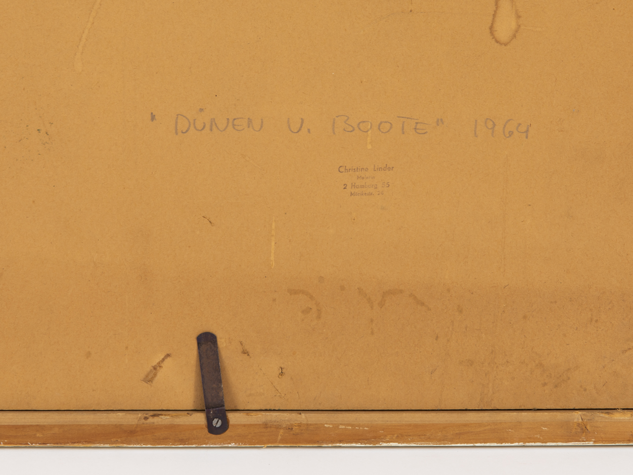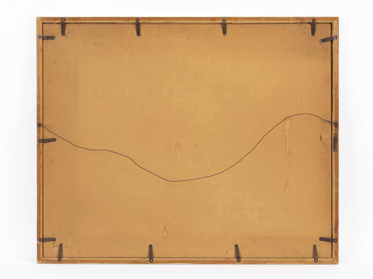 Watercolour on paper; "Dünen und Boote" from 1964; landscape painting in valeuristic colour concept; depiction of several boats floating on a body of water in front of a rugged mountain beneath cumulus clouds; signed and dated lower right; chamois-coloured Passepartout; modern white stepped wooden frame; not opened; under glass; reverse inscribed with the painting’s title and year of creation and bearing the artist’s stamp; age-related signs of wear and discolouration to Passepartout and frame; image size: approx. 46 cm x 59.5 cm; frame size: approx. 68.6 cm x 83.5 cm; total weight: approx. 4.48 kg; shipping exclusively by forwarding agent or at the buyer’s risk.