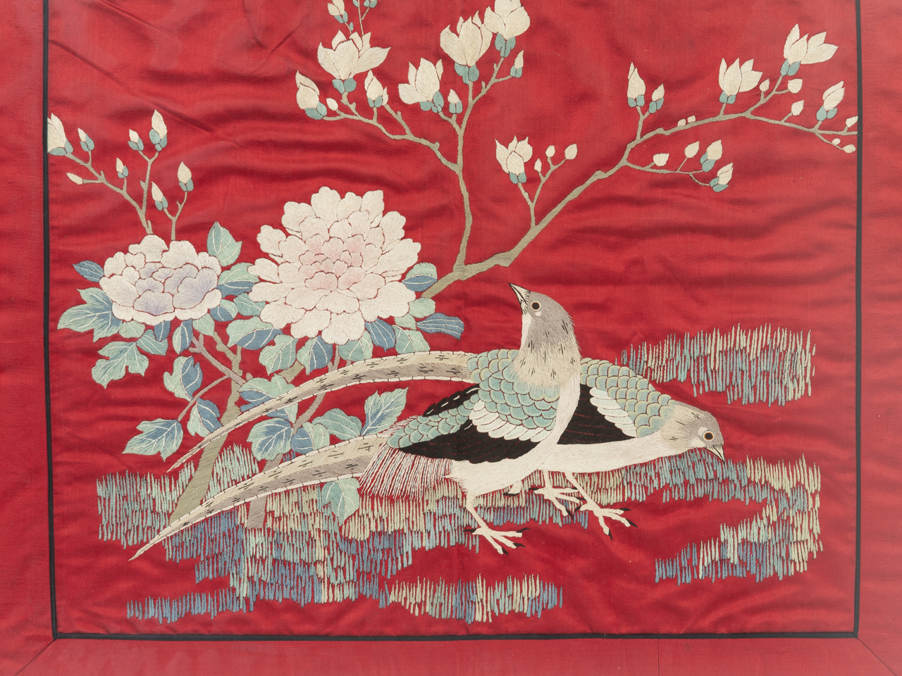 Polychrome embroidery on red silk; naturalistic depiction of a pair of pheasants on a meadow with flowering branches and blooming peonies; under glass; in dark stepped wooden frame; not opened; age-related signs of wear; image size: approx. 49 x 58 cm; frame size: approx.55 x 65 cm; weight: approx. 2.7 kg.