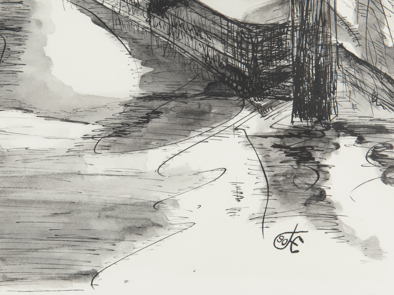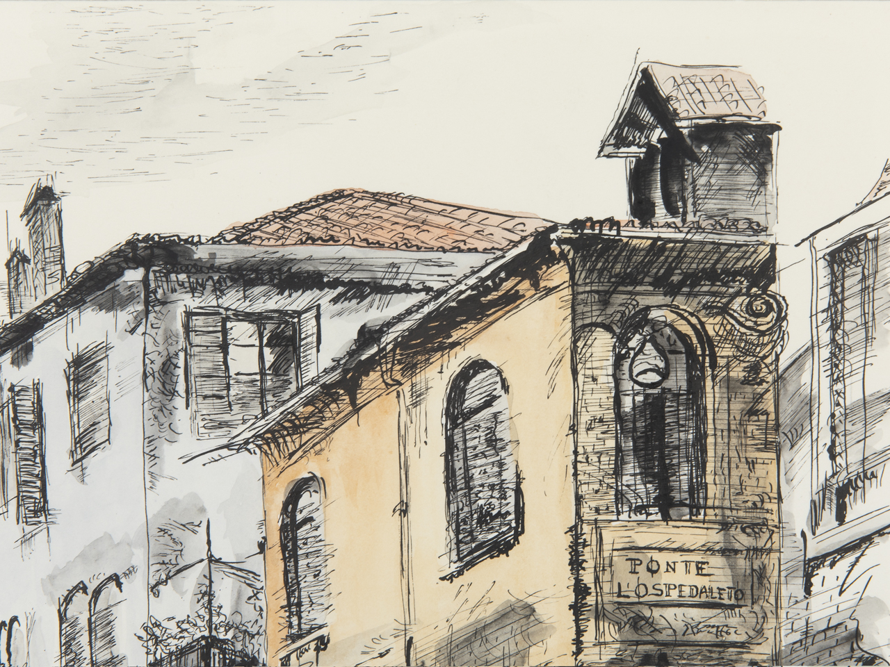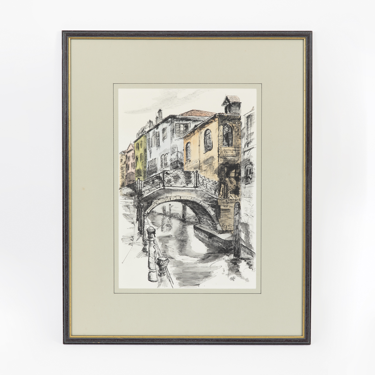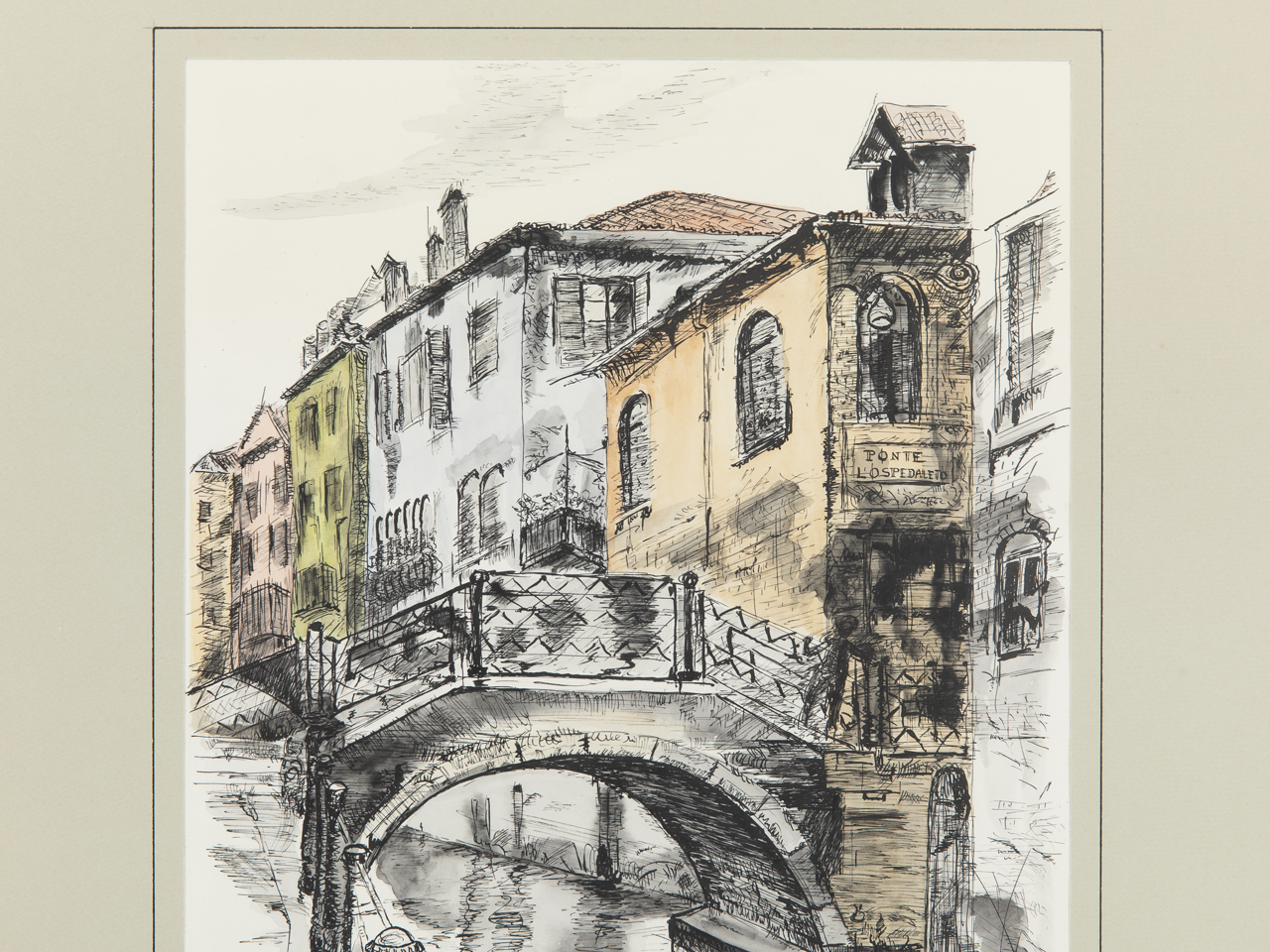 Farblithographie; Landschaftsmalerei; Federzeichnung mit Aquarell koloriert; Blick vom Trottoir auf die venezianische Brücke Ponte de l’Ospedaletto mit umliegenden Häusern; unten links monogrammiert „OE“? und datiert (19)90; graues Passepartout hinter Glas; schmaler brauner Holzrahmen mit goldener Randung; nicht geöffnet; Bildausschnittmaße: ca. 39,5 x 27,5 cm; Rahmenmaße: ca. 62 x 50 cm; Gewicht: ca. 2,7 kg.