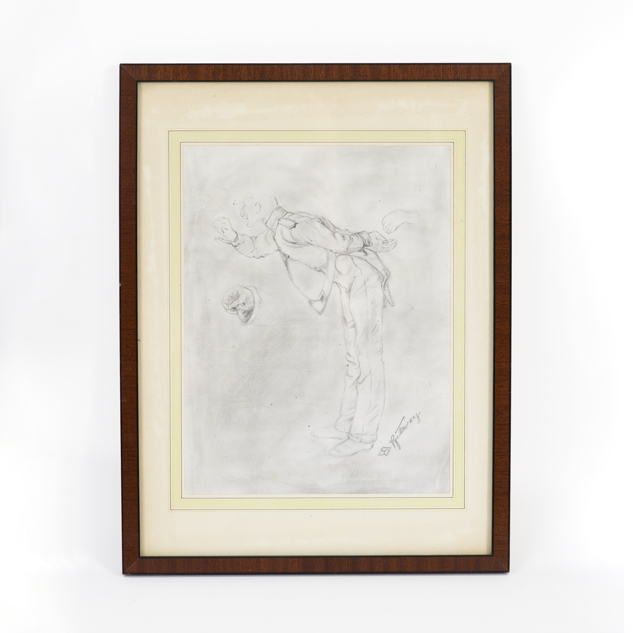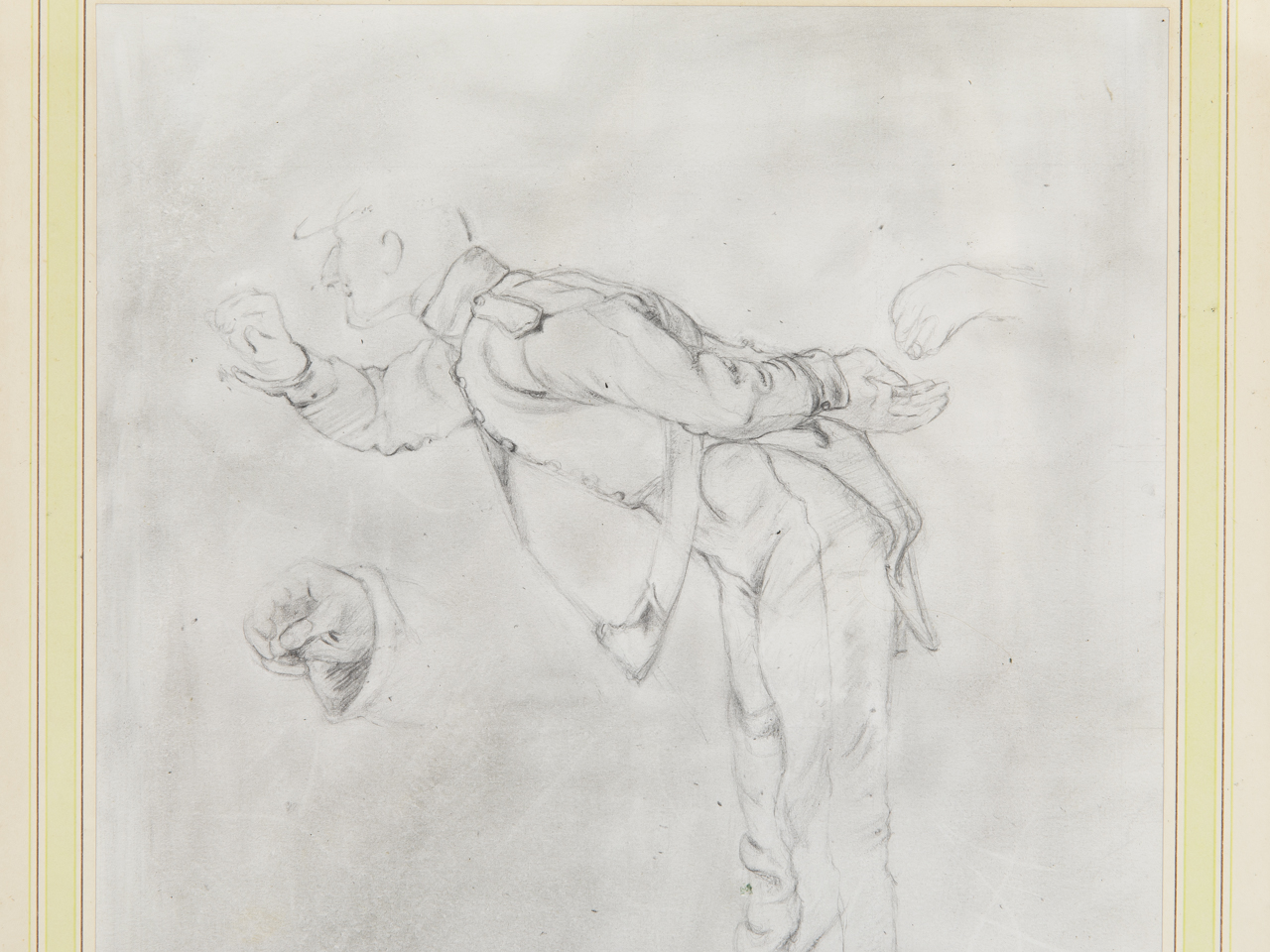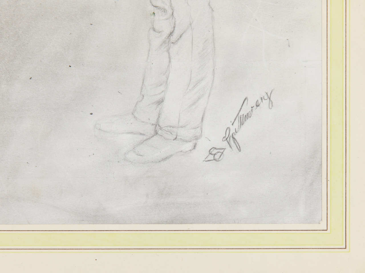 Pencil on paper; realistic sketch; depiction of a man dressed in a kind of uniform, leaning forward in a bowing gesture, with one hand held behind his back; surrounded by two additional sketches of hands; unidentified inscription lower right, possibly a signature; chamois-coloured passepartout with green and violet borders, discoloured with age; behind glass; narrow brown wooden frame with black accents; image section dimensions: approx. 28.8 x 22 cm; frame dimensions: approx. 42 x 32.3 cm; weight: approx. 0.9 kg.