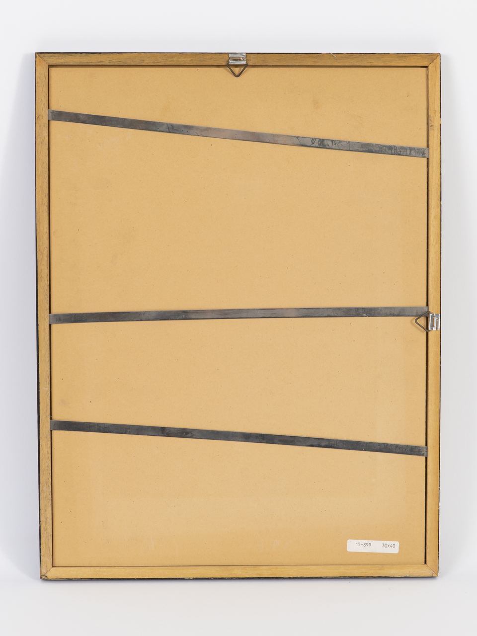Aquatint and etching on paper, coloured; “Cavaliere II” from 1972; abstract, static depiction of a horse with rider in dark blue tones, their forms merging into one another against radiant violet and red colour nuances; numbered in pencil lower left “38/75” and signed lower right; dark wide Passepartout; under glass; narrow silver frame; not opened; image section dimensions: ca. 57 x 48.5 cm; frame dimensions: ca. 80 x 66.5 cm; weight: ca. 3.78 kg.