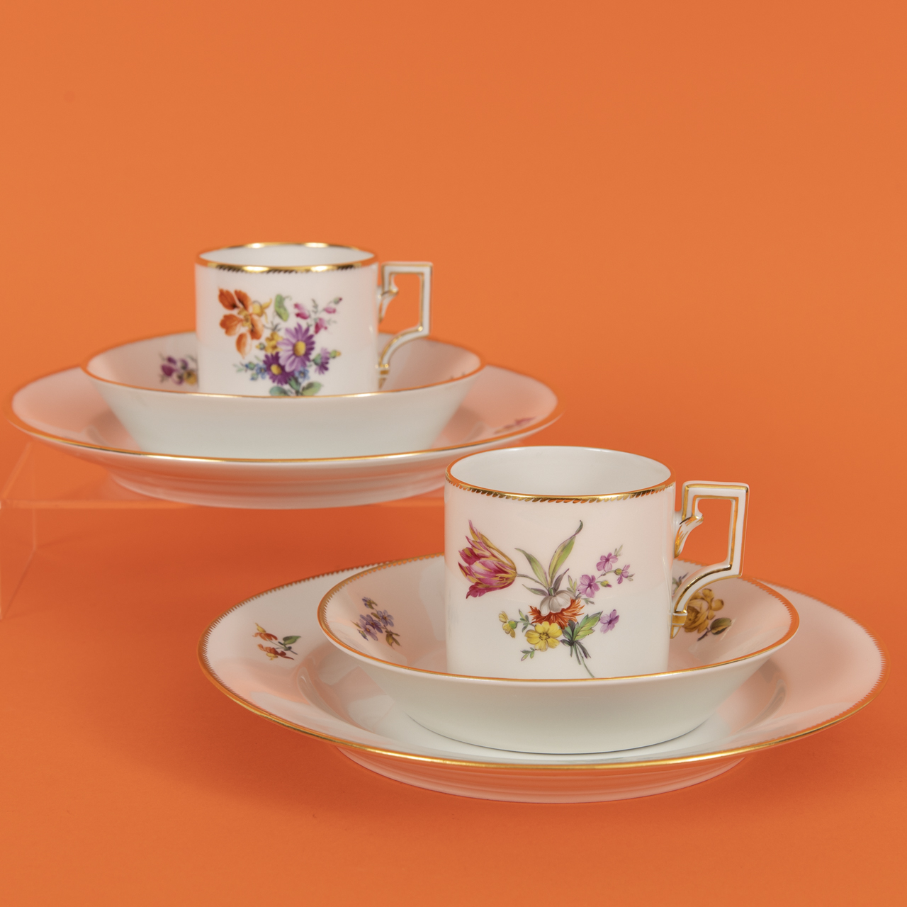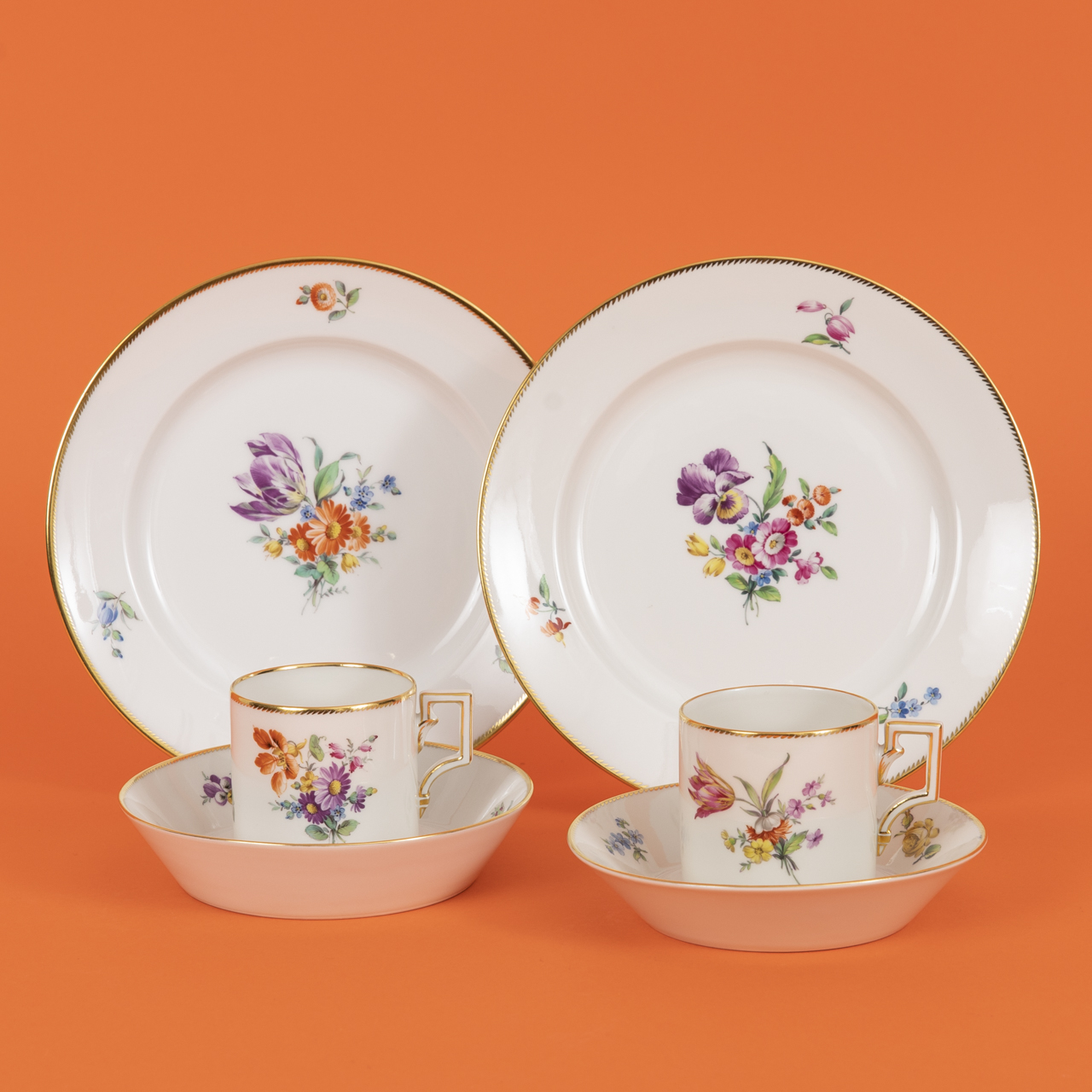 White porcelain in classicist style with polychrome flower painting and fine gilt rims and details; consisting of: 2 mocha cups (H: approx. 5.8 and 6 cm), 2 saucers (D: approx. 13.3 and 13.6 cm), 2 cake plates (D: approx. 19.2 and 19.5 cm); 1st quality and in very good, well-kept condition with few insignificant signs of use; each base with blue sceptre mark (2 × with additional “S” for production in the Selb branch factory in the years after the Second World War until 1957), red orb as well as various marks in black (including painter’s mark) and impressed marks; total weight: approx. 1.2 kg.