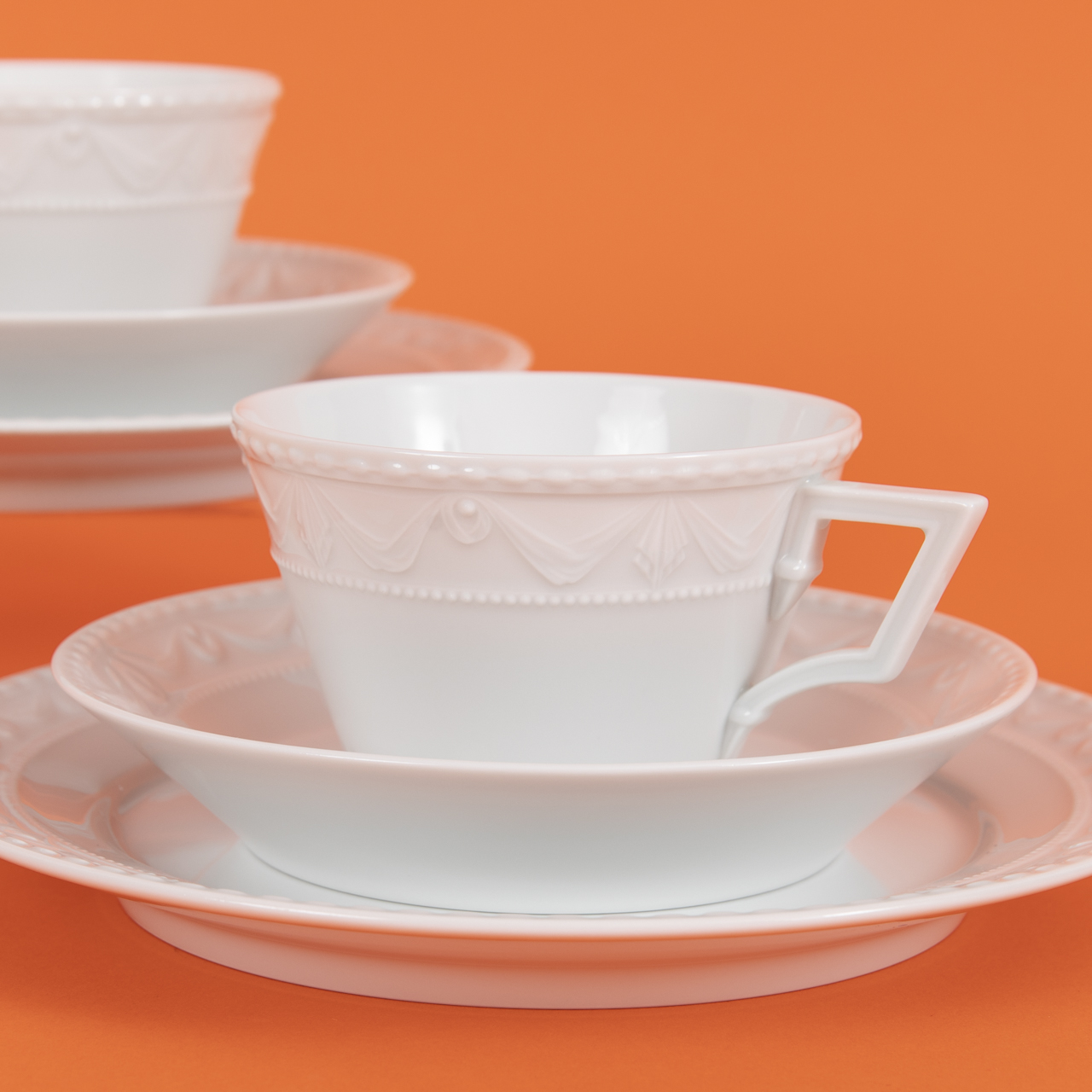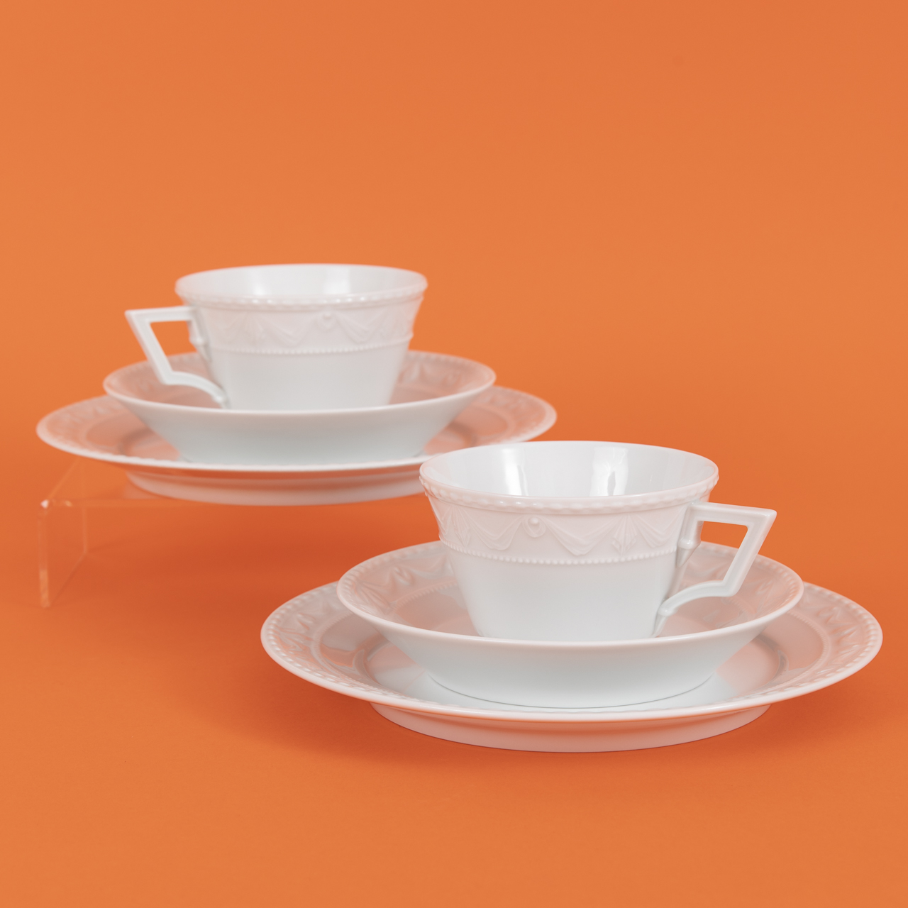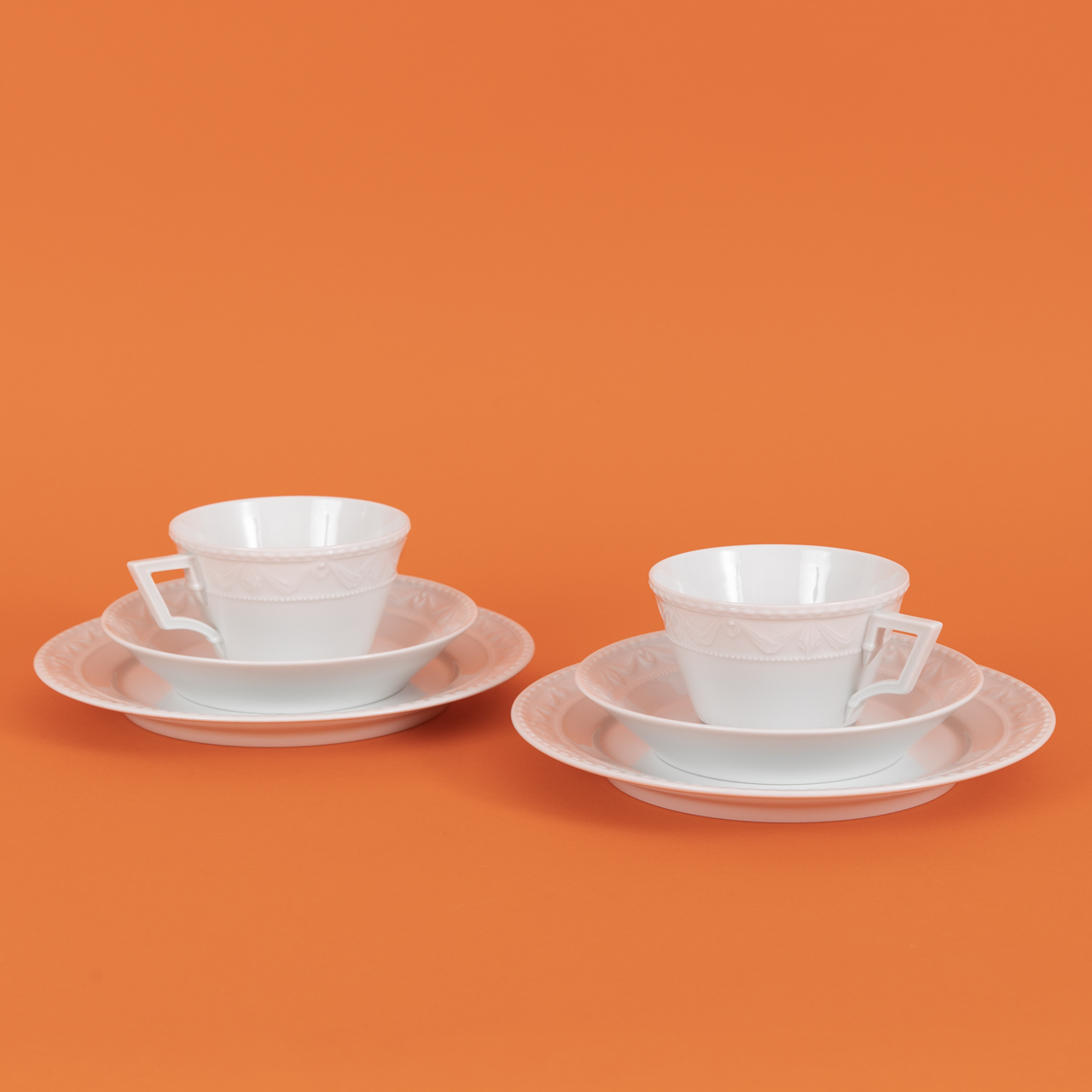 White porcelain with the typical classicist “Kurland” embossed décor (egg-and-dart, swags, pearls); sets consisting of: 2 teacups (H: approx. 5.5 cm), 2 saucers (D: approx. 14.8 cm), 2 cake plates (D: approx. 19.8 cm); 1st quality and in very good condition, only one cake plate with more noticeable signs of use (scratches); underside with blue sceptre mark; weight: approx. 1.3 kg.