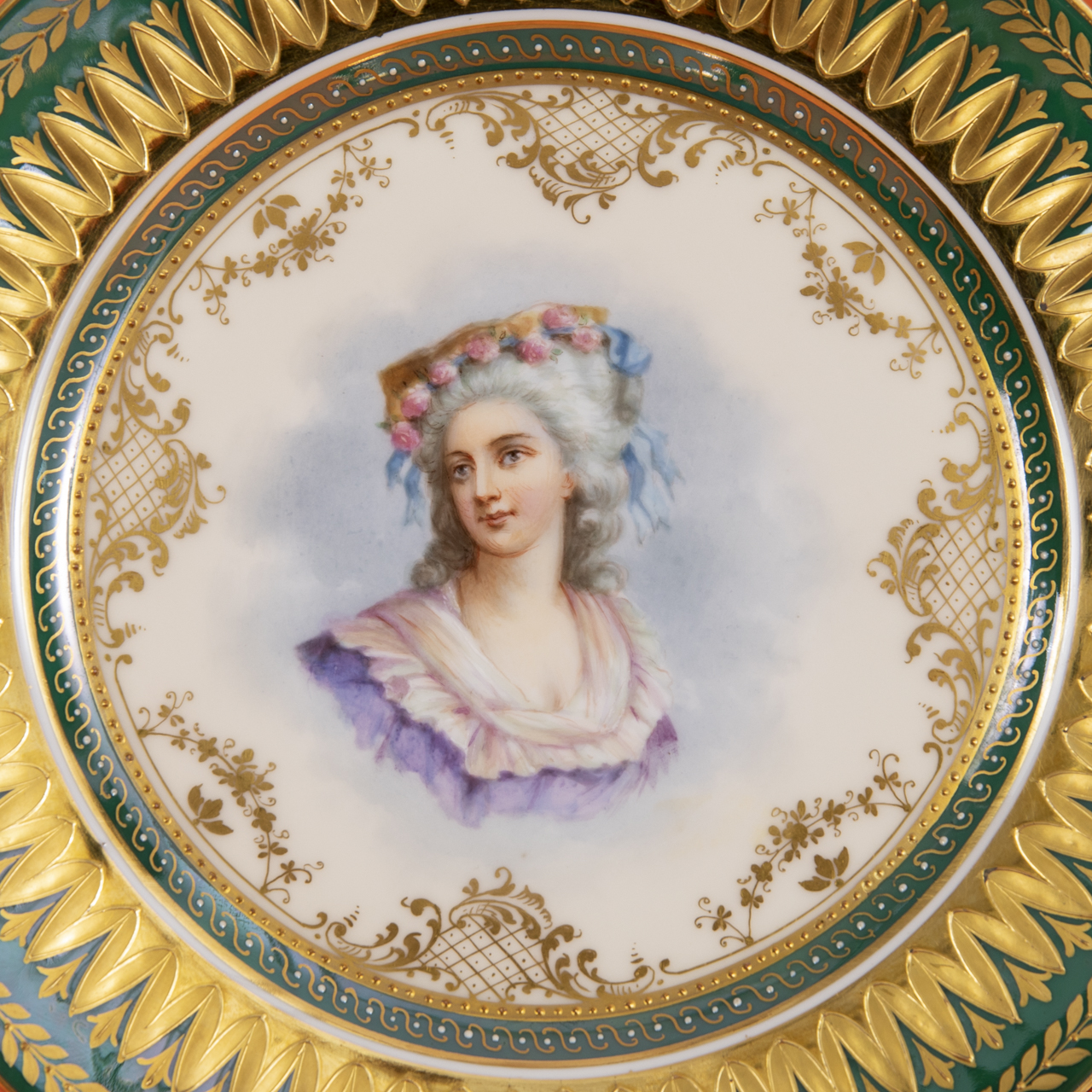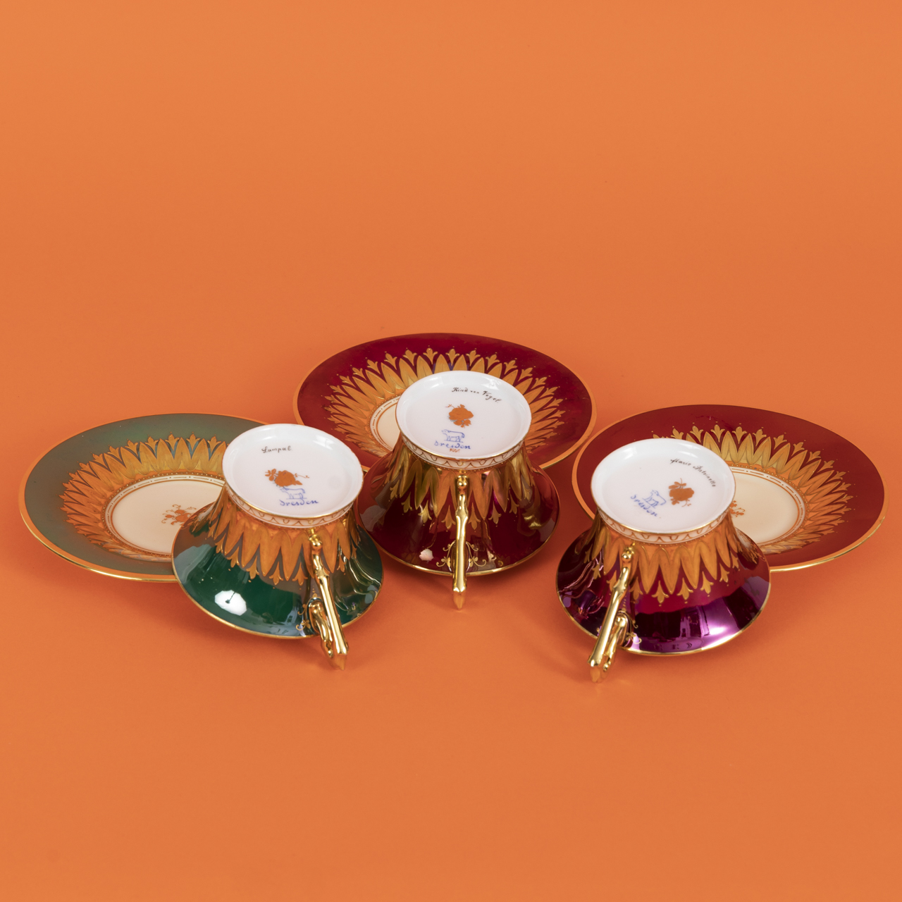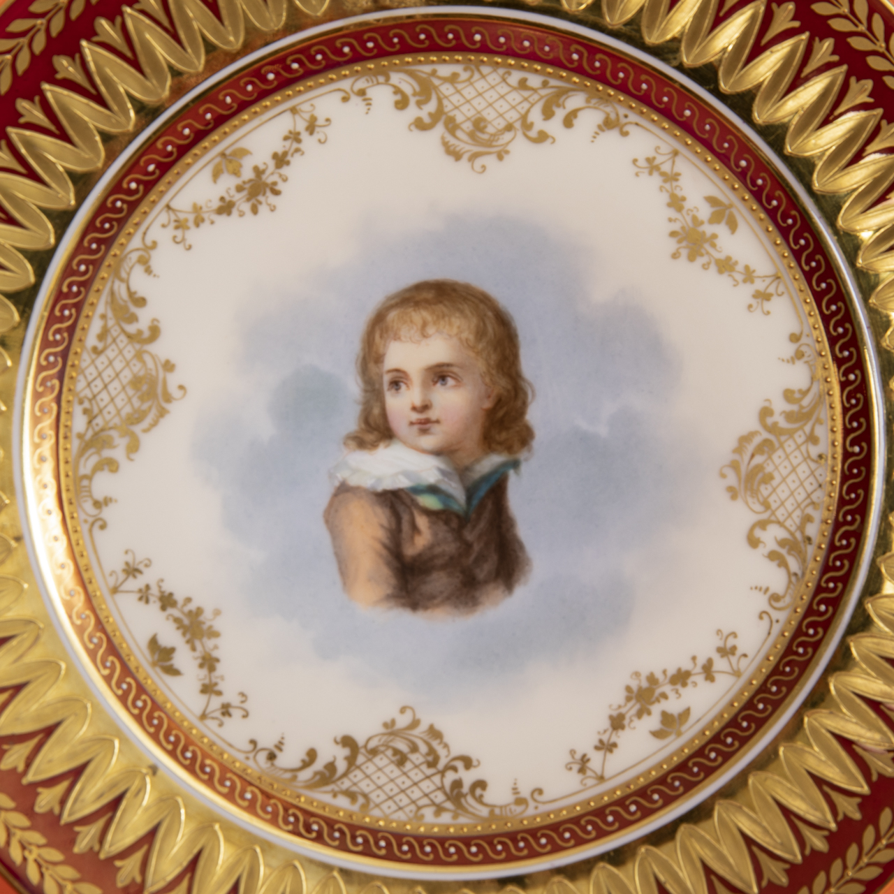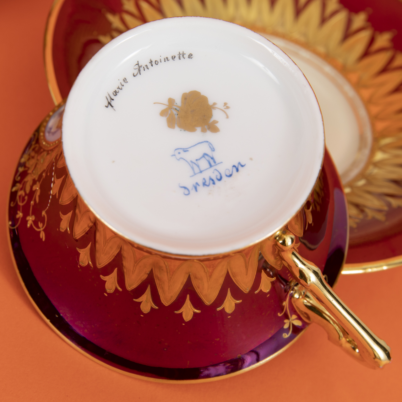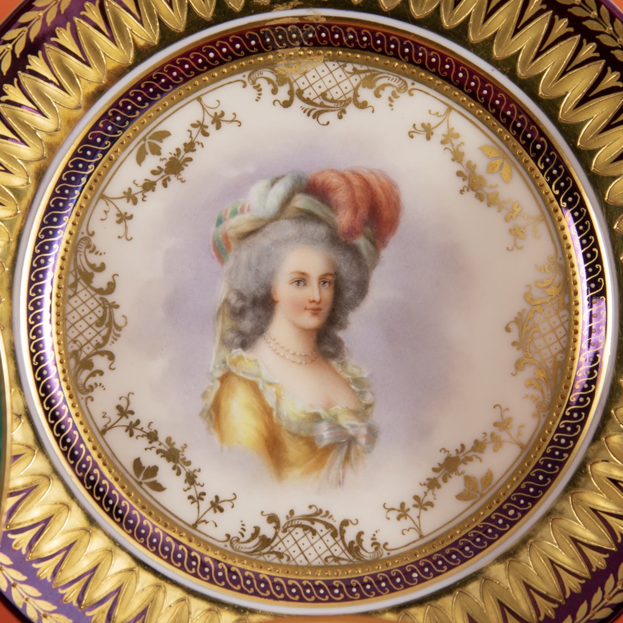 White porcelain with fine polychrome portrait painting in the wells of the plates, with rich gilt decoration and floral raised gilding on coloured ground (red, iridescent purplish red and green); ensemble consisting of: 3 plates (D: approx. 19.2 cm), inscribed on the base “Marie Antoinette (Lebrun)”, “Lampale” and “Child by Vogel. Dresden Gallery” (after a painting by Christian Leberecht Vogel), 3 saucers (D: approx. 14 cm) and 3 coffee cups (H: approx. 5.5 cm); the coffee cups also with small fine corresponding portraits in gold-framed cartouches with cornucopia and floral motifs and with inscriptions of the subjects on the base; good condition with slight age-related signs of wear (fine scratches, one saucer with a small chip on the underside); original porcelain marks overpainted with the golden rose of Lamm and, except for one plate, each with the typical blue Lamm mark with lamb, inscription “Dresden” and various numbers; total weight: approx. 1.2 kg.