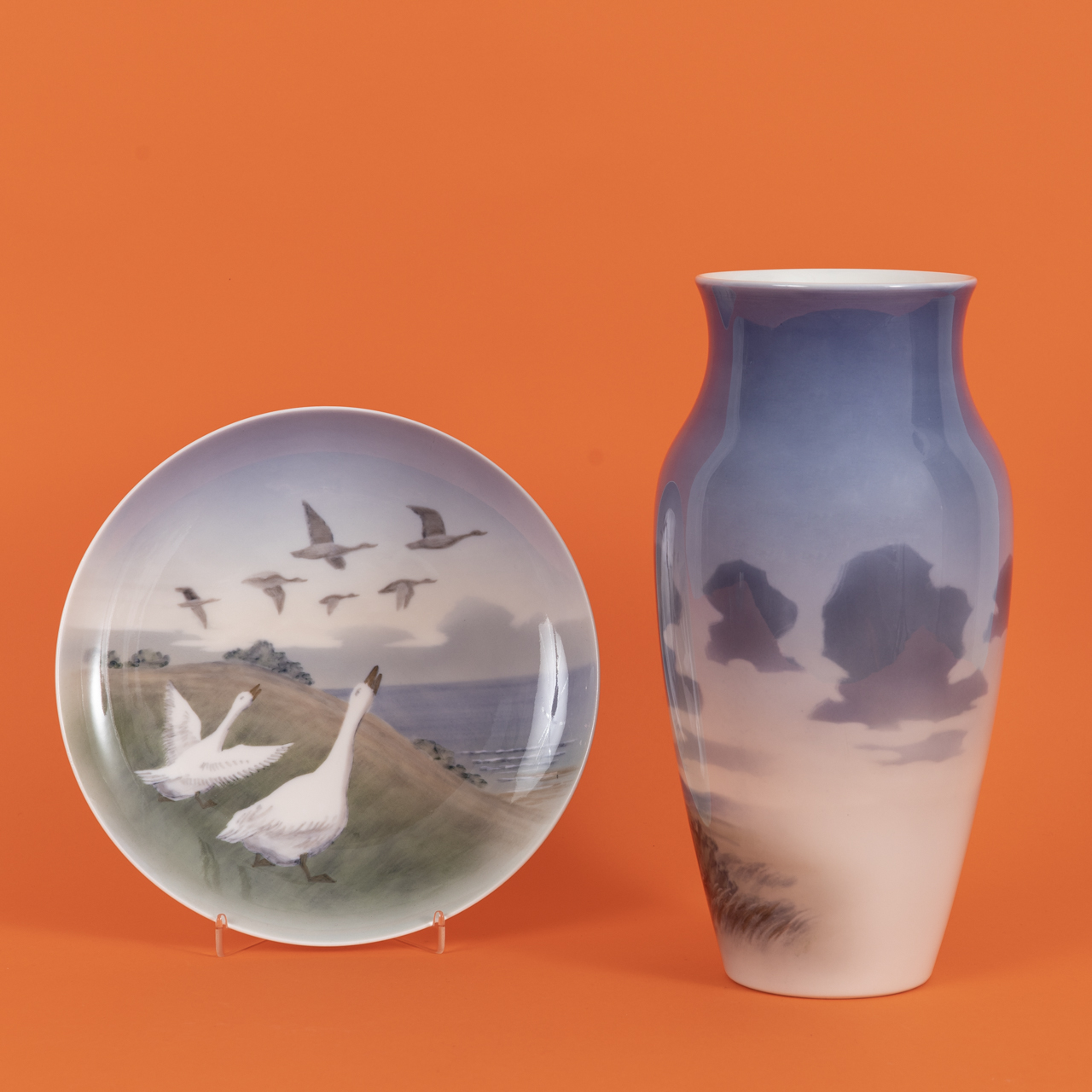 Large vase and wall plate with swans and geese, Royal Copenhagen, Denmark, 20th cent.