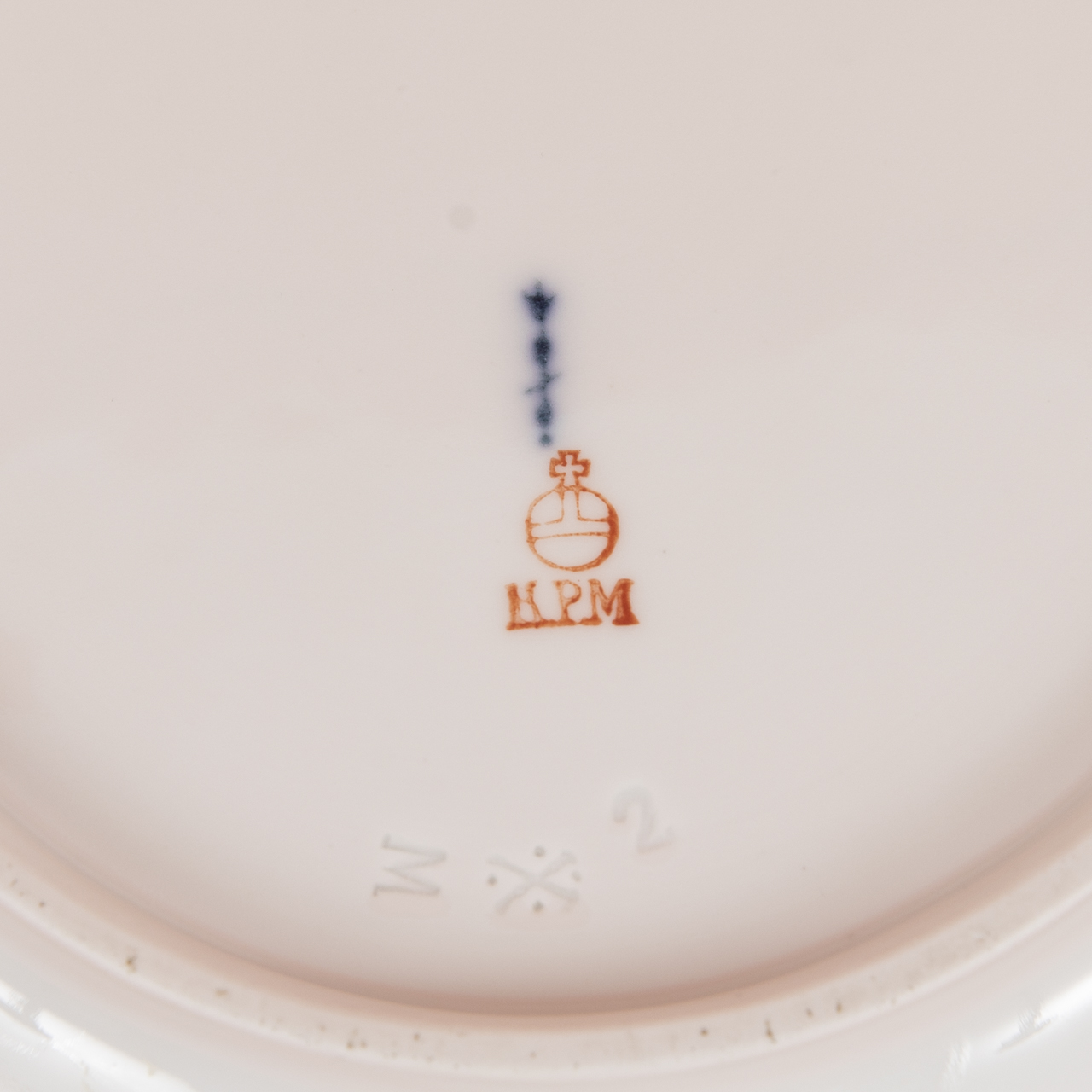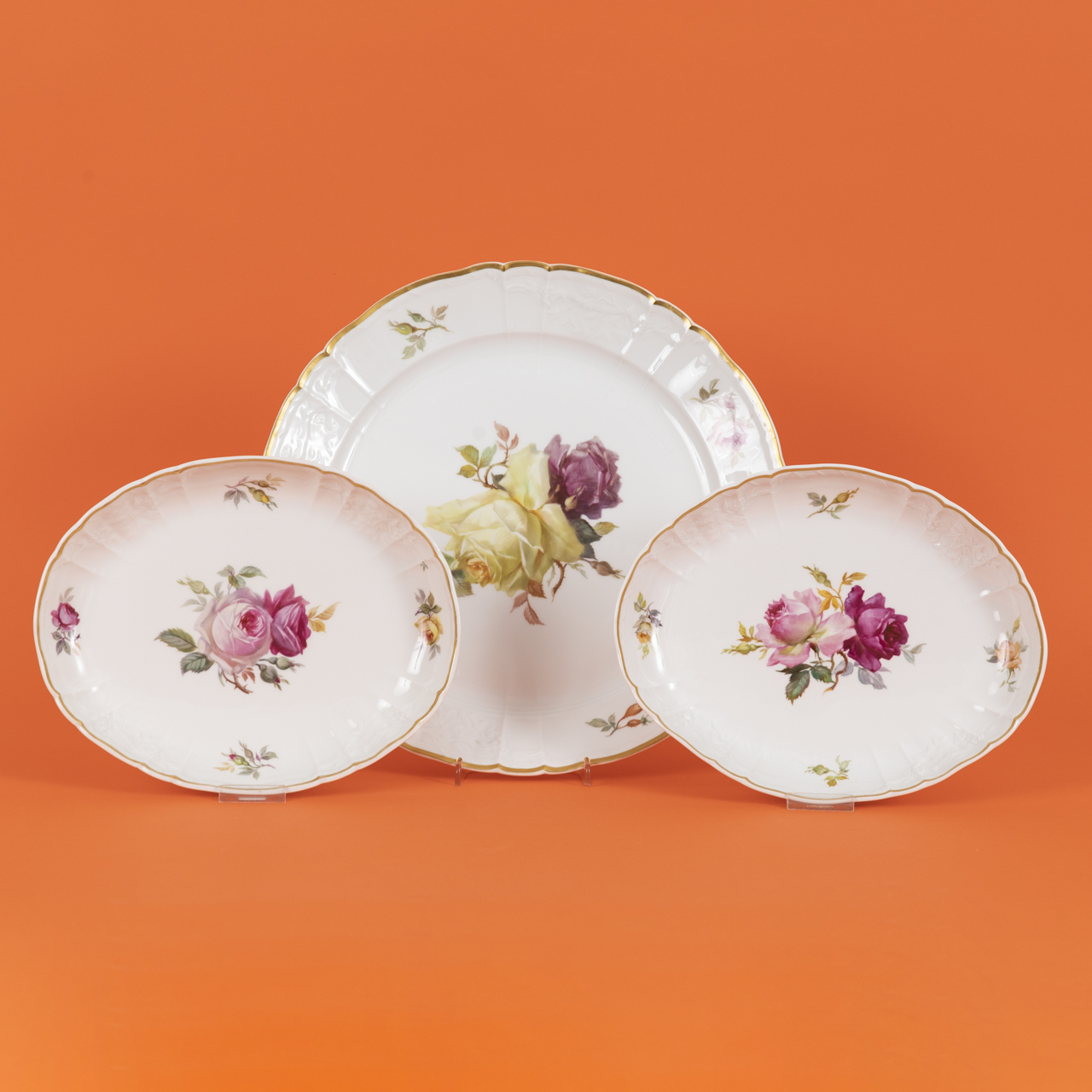 White porcelain with polychrome naturalistic rose blossom painting and gilt rims; lot consisting of: 1 large round plate (D: approx. 34.5 cm), 2 oval bowls (dimensions: approx. 26.2 × 21 and 27 × 21.3 cm); 1st quality and in very good, well-kept condition with few insignificant signs of use; each with underglaze blue sceptre mark, red orb and various painter’s and other marks in black and other colours as well as impressed marks; total weight: approx. 2.5 kg.