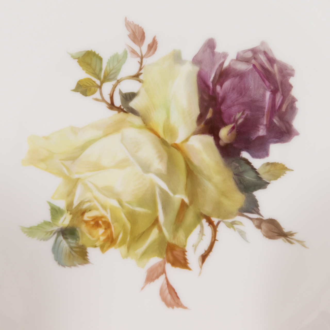 Weißporzellan mit polychromer naturalistischer Rosenblüten Malerei und goldenen Rändern; Konvolut bestehend aus: 1 große Rundplatte (D: ca. 34,5 cm), 2 ovale Schalen (Maße ca. 26,2 x 21 und 27 x 21,3 cm); 1. Wahl und im sehr guten gepflegten Zustand mit wenigen unwesentlichen Gebrauchsspuren; im Boden jeweils blaue Zeptermarke, roter Reichsapfel sowie diverse Beizeichen in schwarz u.a. Farben (u.a. Malermarke) und Blindstempel; Gesamtgewicht: ca. 2,5 kg.