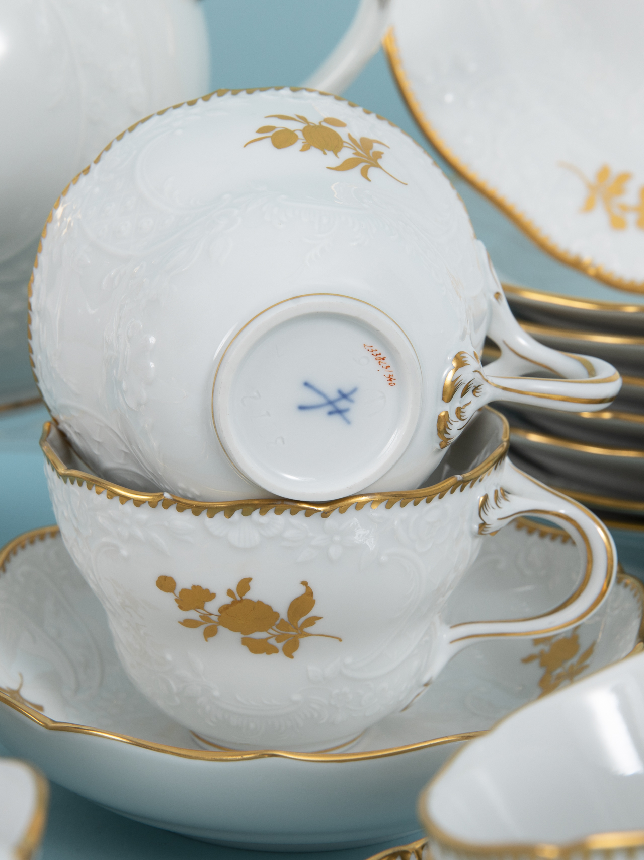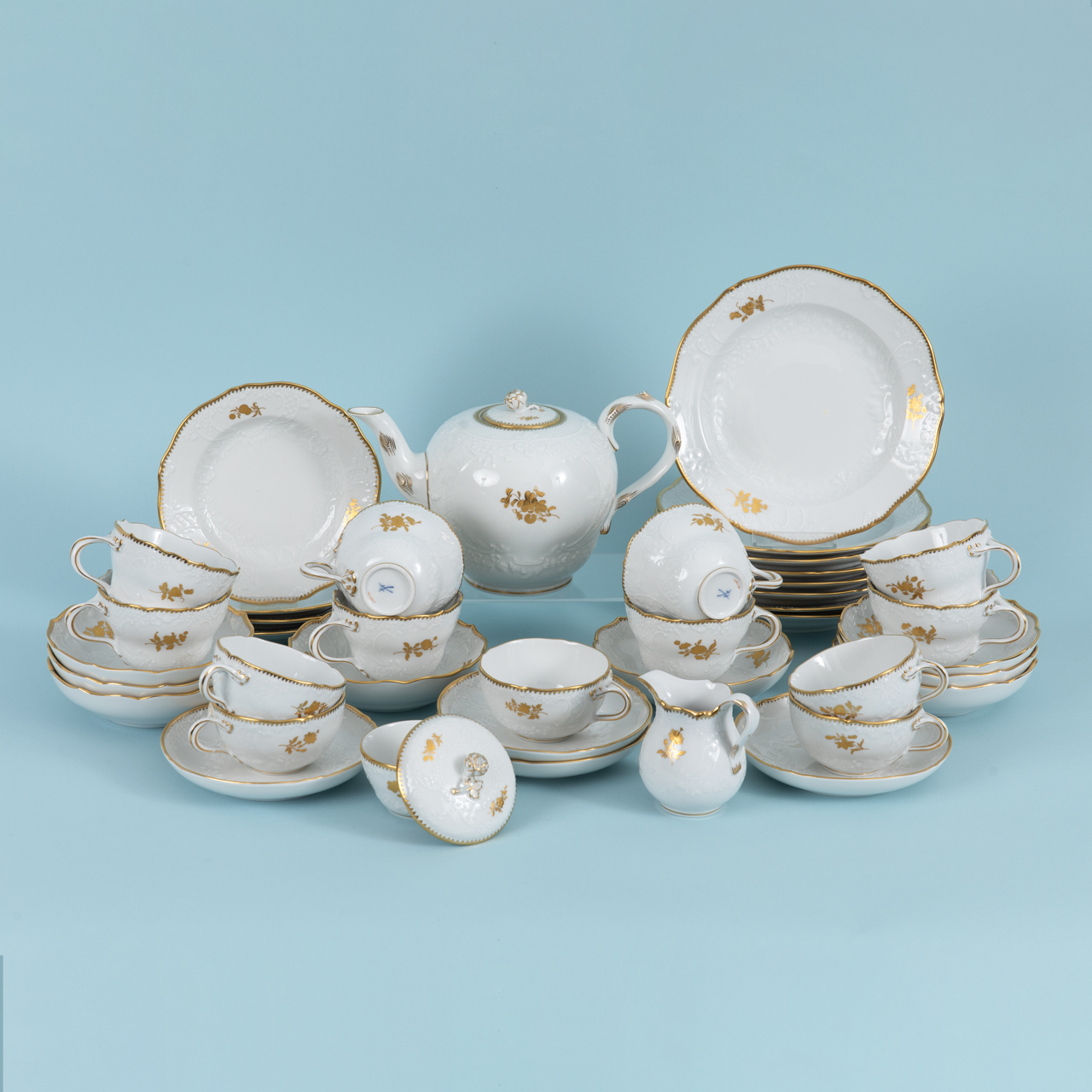 Weißporzellan mit goldfarbener Blumenmalerei und Goldrand; 40-teiliges Konvolut mit Dekor „Goldzweig in den Schildern, Goldzahnkette, Goldrand“ bestehend aus: 5 Teetassen (H: ca. 4,8 cm), 8 Kaffeetassen (H: ca. 6,2 cm), 4 Unterteller für Teetassen (D: ca. 13,2 cm), 8 Unterteller für Kaffeetassen (D: ca. 13,4 cm), 8 Kuchenteller (D: ca. 19,8 cm), 4 Gebäckteller (D: ca. 15,8 cm), Rahmgießer (H: ca. 8,3 cm), Zuckerdose (H: ca. 6,8 cm), Teekanne (H: ca. 13,8 cm); I. Wahl; unter Glasur blaue Schwertermarken und Beizeichen (Blindstempel, Malermarken); sehr guter Erhaltungszustand mit minimalen Gebrauchsspuren; Gesamtgewicht: ca. 7,4 kg.