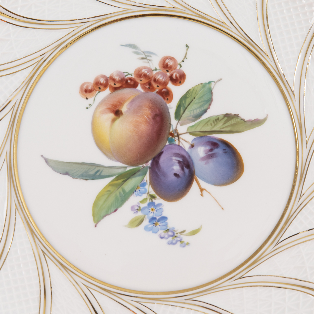 White porcelain with polychrome naturalistic fruit painting as well as gilt rims and gilt decoration; form with fan relief with various patterns and smooth well with motif; 1st quality and in good condition with light signs of use (a few fine scratches and occasional slight wear to the gilding); underside with underglaze blue crossed swords marks and impressed marks; weight: approx. 840 g