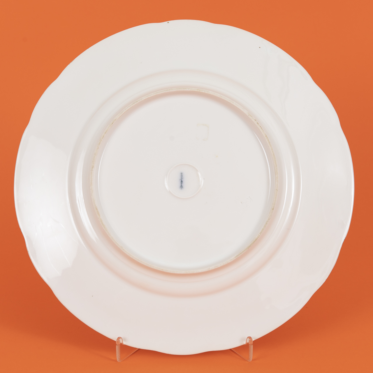 White porcelain with polychrome portrait painting, rim with green ground decoration and surrounding floral and ornamental raised gilt decoration; plate in slightly recessed form with lobed and scrolled rim; 1st quality and in very good condition; diameter: approx. 26.5 cm; underside with earlier blue sceptre mark and impressed mark; weight: approx. 570 g.