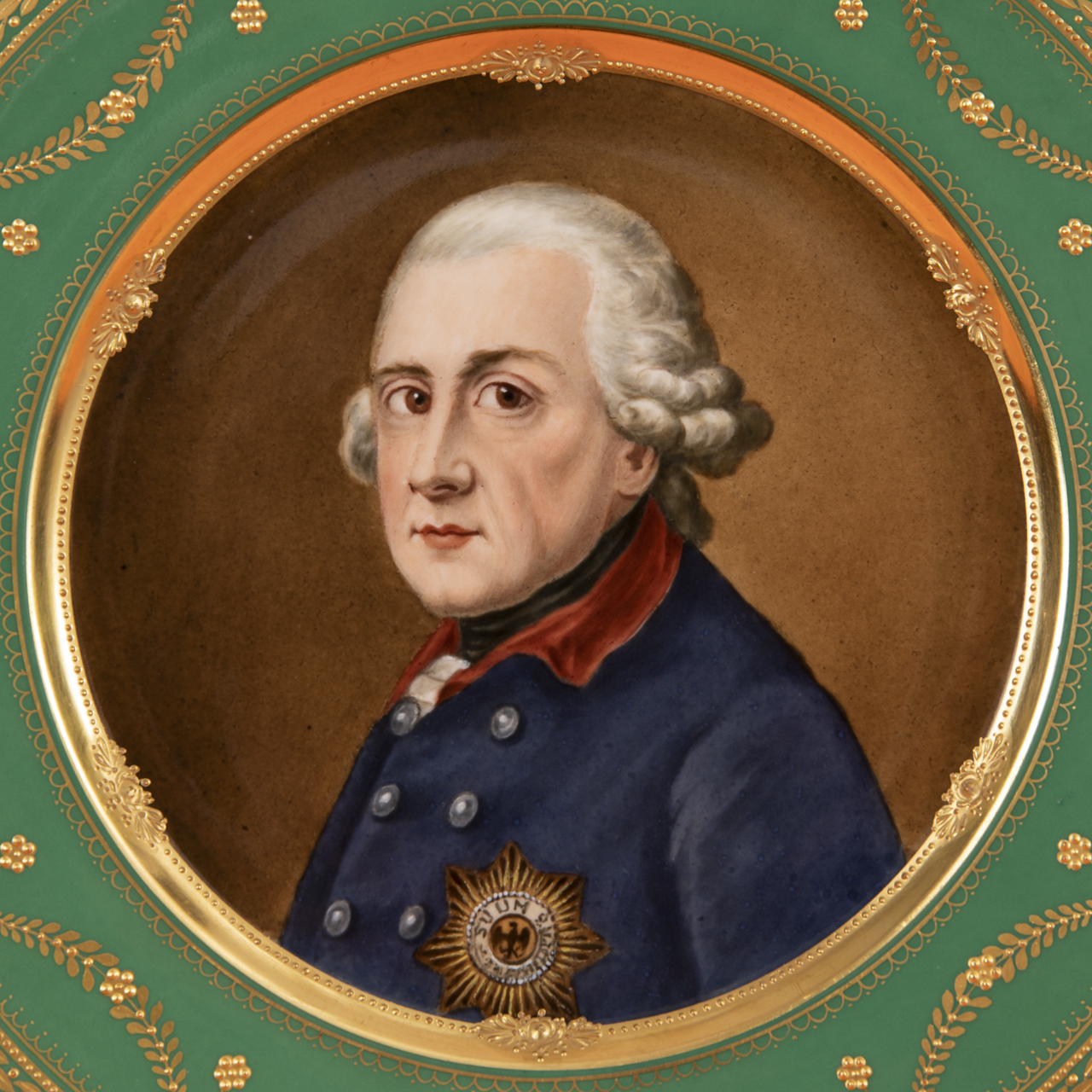 Weißporzellan mit polychromer Portraitmalerei, Fahne mit grünem Fondsdekor und umlaufend floralem- und ornamentalem Dekor aus Reliefgold; Teller leicht vertiefte Form mit passig geschweiftem Rand; 1. Wahl und sehr guter Zustand; Durchmesser ca. 26,5 cm; im Boden ältere blaue Zeptermarke und Blindstempel; Gewicht ca. 570 g.