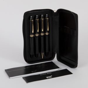 Calf leather, matt waxed, front with Montblanc emblem, interior embossed “MONTBLANC” and “MADE IN GERMANY”; containing 4 Meisterstück writing instruments, each with barrel in black precious resin, cap in black precious resin with Montblanc emblem inlaid at the cap top, gilt rings and clips, each cap ring inscribed “MONTBLANC MEISTERSTÜCK” and 3 x model number, each clip ring inscribed “GERMANY” and 3 x individual serial number; 1) fountain pen “No.146”, 2) ballpoint pen “No.162”, 3) fineliner, 4) highlighter “No.166” (without refill); very good condition; length of writing instruments: ca. 14 – 14.5 cm; case weight: 129 g, total weight: ca. 244 g.