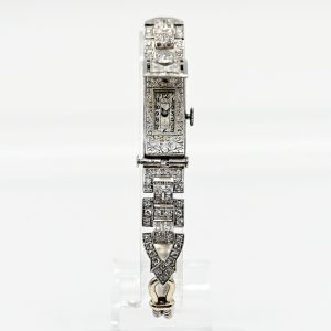 Central section in platinum; total weight: approx. 15.3 g; rectangular case with hinged cover; small dial with black Arabic numerals and blued hands; bezel edge and sides decorated with fine ornamental engraving; lateral extensions in openwork geometric design; cover and extensions richly set with diamonds; centre stone: approx. 0.14 ct; colour: E-F; clarity: piqué; side single-cut diamonds, total approx. 1.16 ct; colour: F-H; clarity: VS-piqué; dimensions of the central section: approx. 8 cm; width: approx. 11.2 mm; height: approx. 7.1 mm; extension bracelet in 585/- white gold with safety folding clasp and double-row snake chain pattern; safety glass missing; total length: approx. 16.5 cm; no guarantee on movement or function.