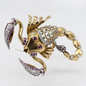 750/- yellow gold; total weight: approx. 26 g; semi-plastic scorpion; richly set with 97 rubies, 14 emeralds and 46 single-cut diamonds, total approx. 1 ct; colour and clarity: in the upper range; pavé and individually set stones; dimensions of the brooch: approx. 66.5 x 58 mm; height: approx. 12.5 mm.