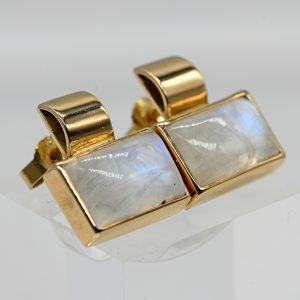 750/- yellow gold; total weight: approx. 7.7 g; moonstone cabochons with adularescence and rutile needles set in rectangular bezel settings; dimensions of bezel: approx. 9.3 x 13 mm; height: approx. 6.8 mm; each surmounted by an open, golden, semi-arched rectangle; dimensions: approx. 7.7 x 5.9 mm; height: approx. 2.8 mm; total length: approx. 16.8 mm.