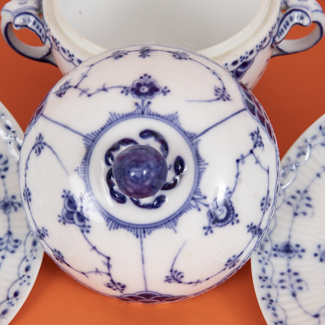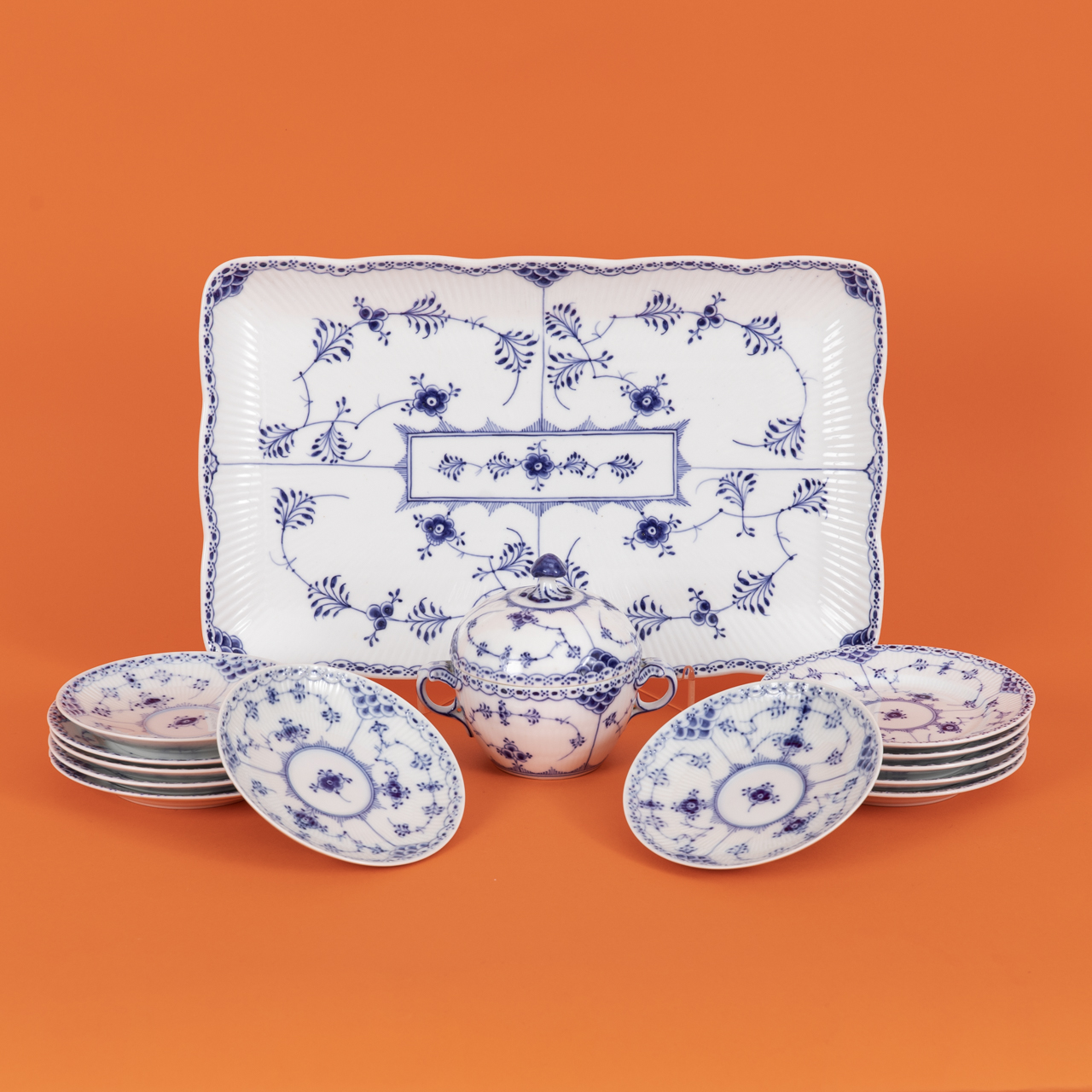 White porcelain Musselmalet Half Lace with blue underglaze; comprising: 3 saucers (D: 6.5 cm), 1 sugar bowl (H: 13.5 cm), 9 pastry plates (D: 16 cm), 1 saucer (D: 13 cm), 1 tray (25 cm x 41 cm); age-related signs of wear, small chip on the rim of the sugar bowl; underside with green Royal Copenhagen Denmark mark and additional symbols; pastry plates from different years, 1 plate second quality; the following models are included: 1/656, 1/606, 1/575, 1/656, 1/545; total weight: approx. 4.7 kg.