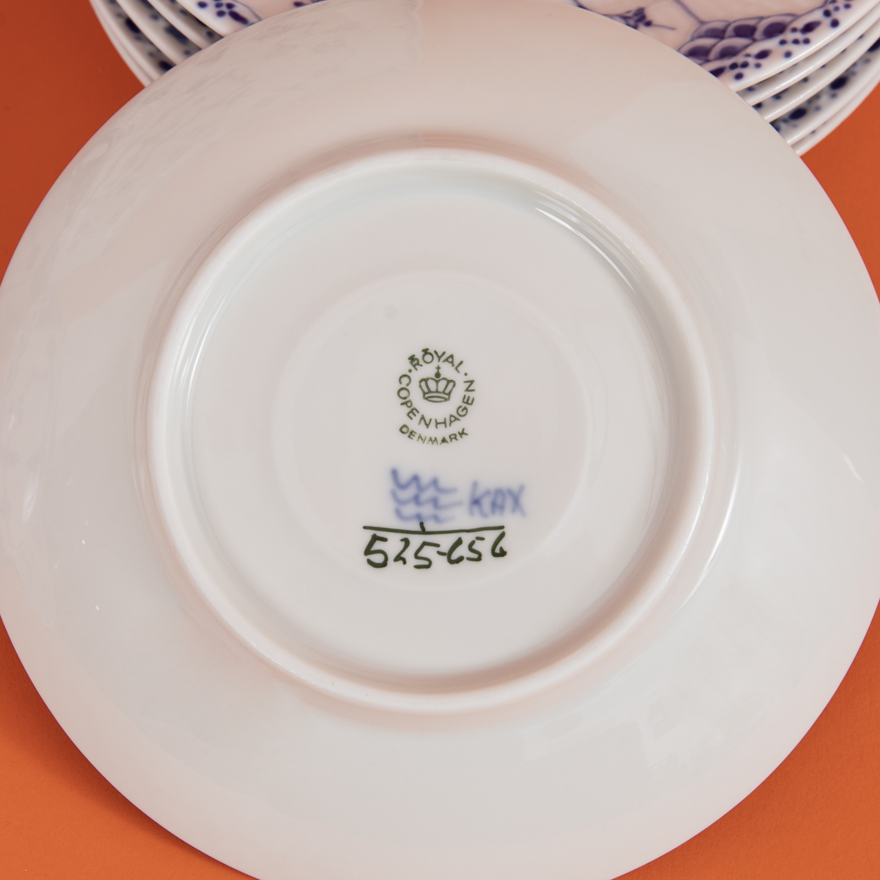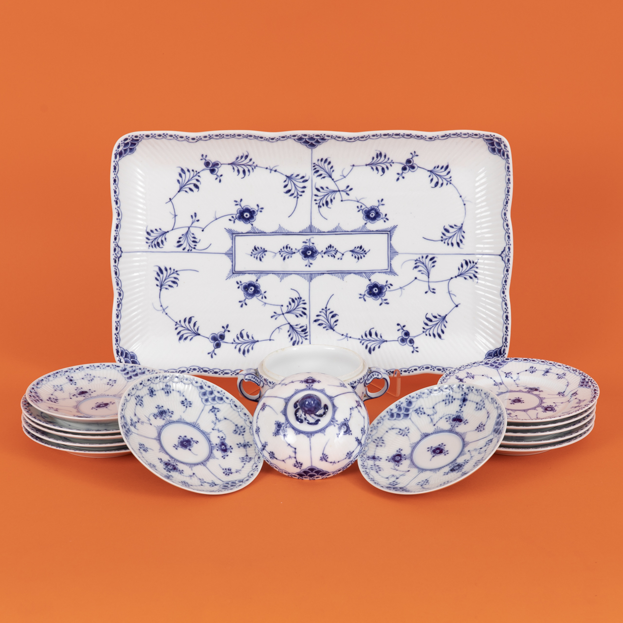 Weißporzellan Musselmalet Halbspitze mit blauer Unterglasur; bestehend aus: 3 Untertassen (D: 6,5 cm), 1 Zuckerdose (H: 13,5 cm), 9 Gebäcktellern (D: 16 cm), 1 Untertasse (D: 13 cm), 1 Tablett (Maße: 25 cm x 41 cm); altersbedingte Gebrauchsspuren, kleiner Chip am Rand der Zuckerdose; unterseitig grüne Royal Copenhagen Danmark-Stempelmarke und weitere Beizeichen; Gebäckteller unterschiedlicher Jahrgänge, 1 Teller 2. Wahl; folgende Modelle sind enthalten: 1/656, 1/606, 1/575, 1/656, 1/545; Gesamtgewicht: ca. 4,7 kg.