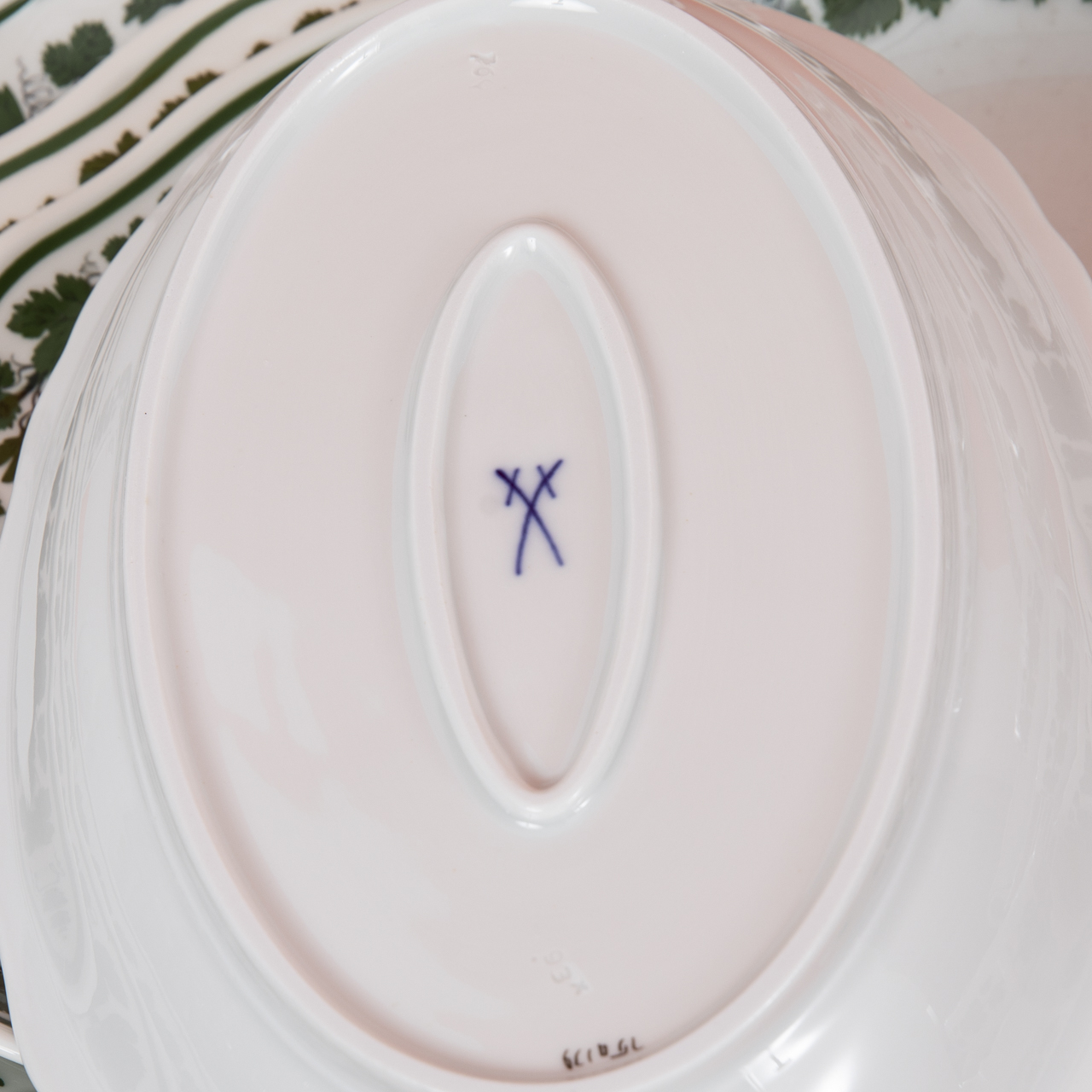 Weißporzellan Form „Neuer Ausschnitt“ mit Dekor „Voller grüner Weinkranz, weißer Rand“; Konvolut bestehend aus: 5 Suppentassen (D: ca. 17 cm mit Henkeln), 1 Schinkenbrettchen (L: ca. 20,7 cm), 1 Gemüseschale (Maße: ca. 22,3 x 22,3 cm), 1 Sauciere (H: ca. 15,7 cm), 2 ovale Schalen (L: ca. 24,7 und 25,4 cm), 3 ovale Platten (L: ca. 29,8 - 42,8 cm), 1 große runde Terrine (H: ca. 22 cm), 1 flache quadratische Schale (Maße: ca. 21 x 21 cm), 8 Speiseteller (D: ca. 24,5 - 26 cm), 1 Rundplatte mit wellenförmigem Rand (D: ca. 27 cm), 1 Rundplatte (D: ca. 28 cm); größtenteils 1 - 3 Schleifstriche und guter, gepflegter Zustand, wenige Teile mit stärkeren Gebrauchsspuren (1 ovale Schale mit feinen grauen Glasurschäden), 1 Suppentasse und Schüssel mit kleinem Chip am Standring, flache quadratische Schale mit winzigem Randchip; unter Glasur blaue Schwertermarken verschiedener Zeiten (Ende 19. und 20. Jh.) und Beizeichen (Blindstempel und Malermarken in Schwarz); Gewicht: ca. 18,2 kg.