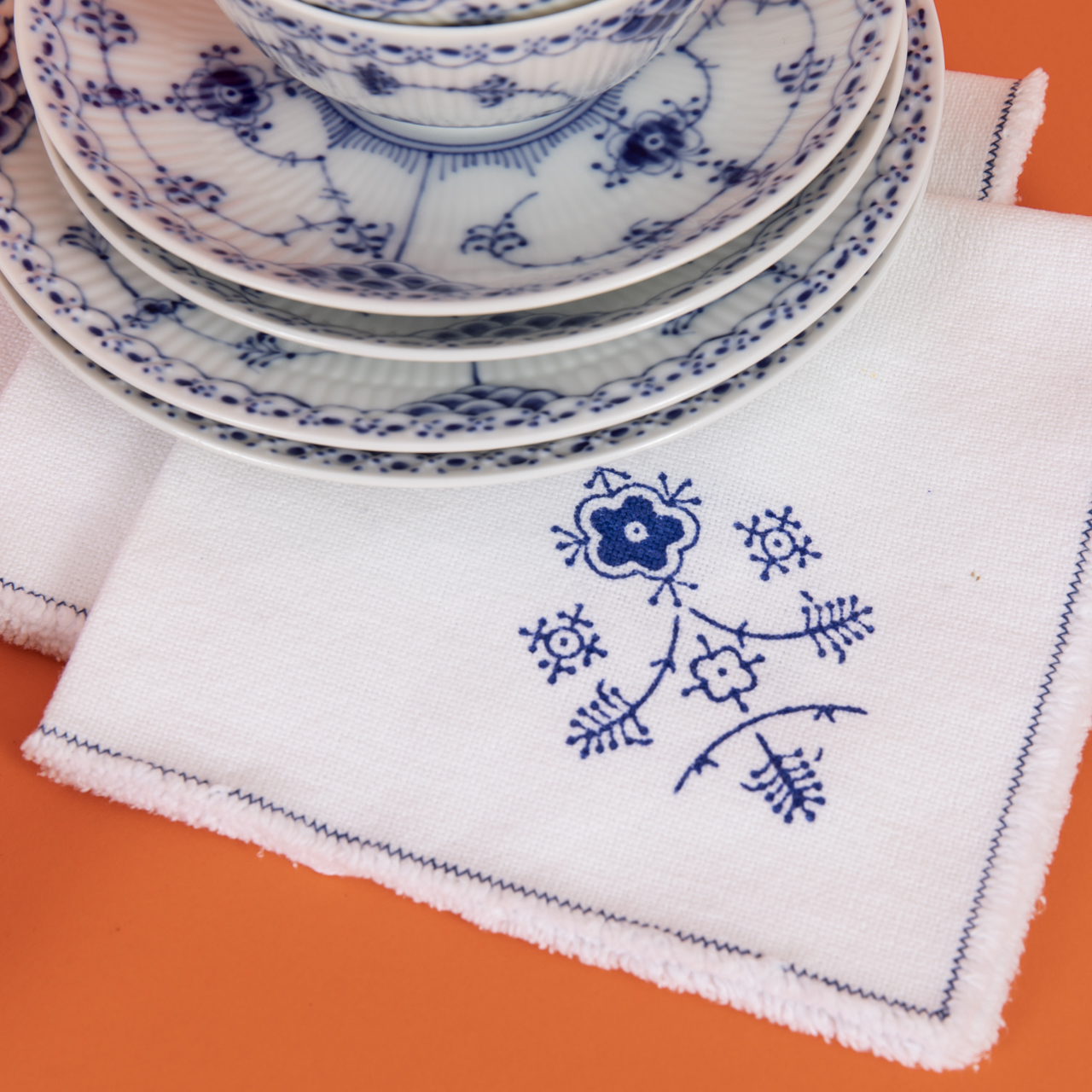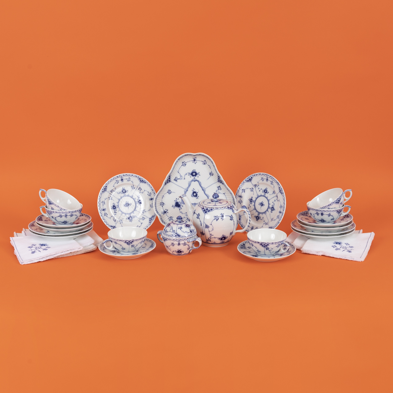 White porcelain with underglaze blue musselmalet painting on the form “half lace” (“blue fluted half lace”); service consisting of: 1 teapot (H: approx. 14 cm), 6 tea sets with 6 teacups (H: approx. 5 cm), 6 saucers (D: approx. 14.7 cm), 6 cake plates (D: approx. 17.2 cm), 1 sugar bowl (H: approx. 9.8 cm), 1 biscuit dish (dimensions: approx. 21 × 22.5 cm), 6 white cloth napkins with blue design in the manner of musselmalet (dimensions: 2 × approx. 36 × 36 cm, 4 × approx. 31 × 31 cm); all 1st quality and in very good condition with minimal signs of use; underside with factory mark as well as painter’s and model numbers; total weight: approx. 4.7 kg.