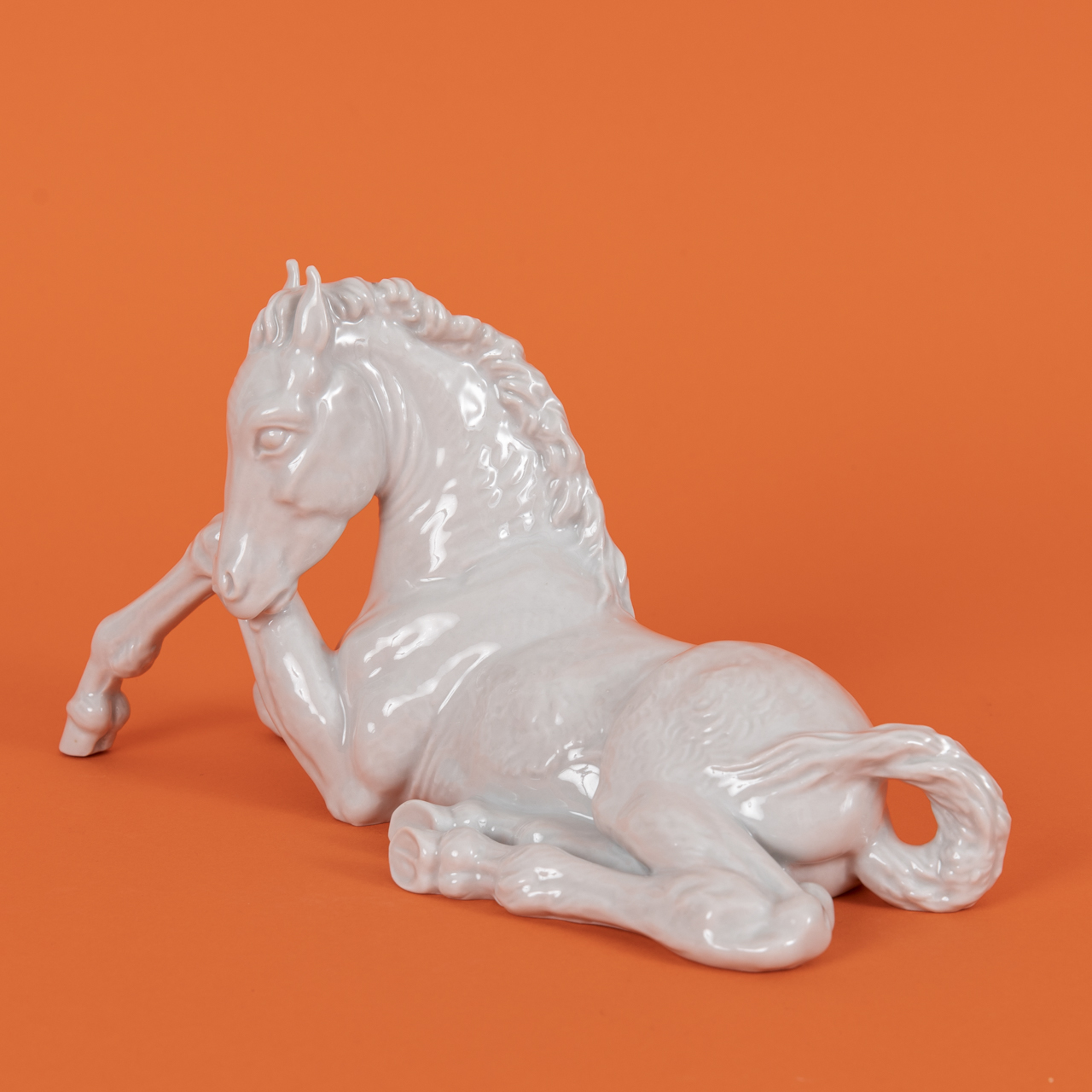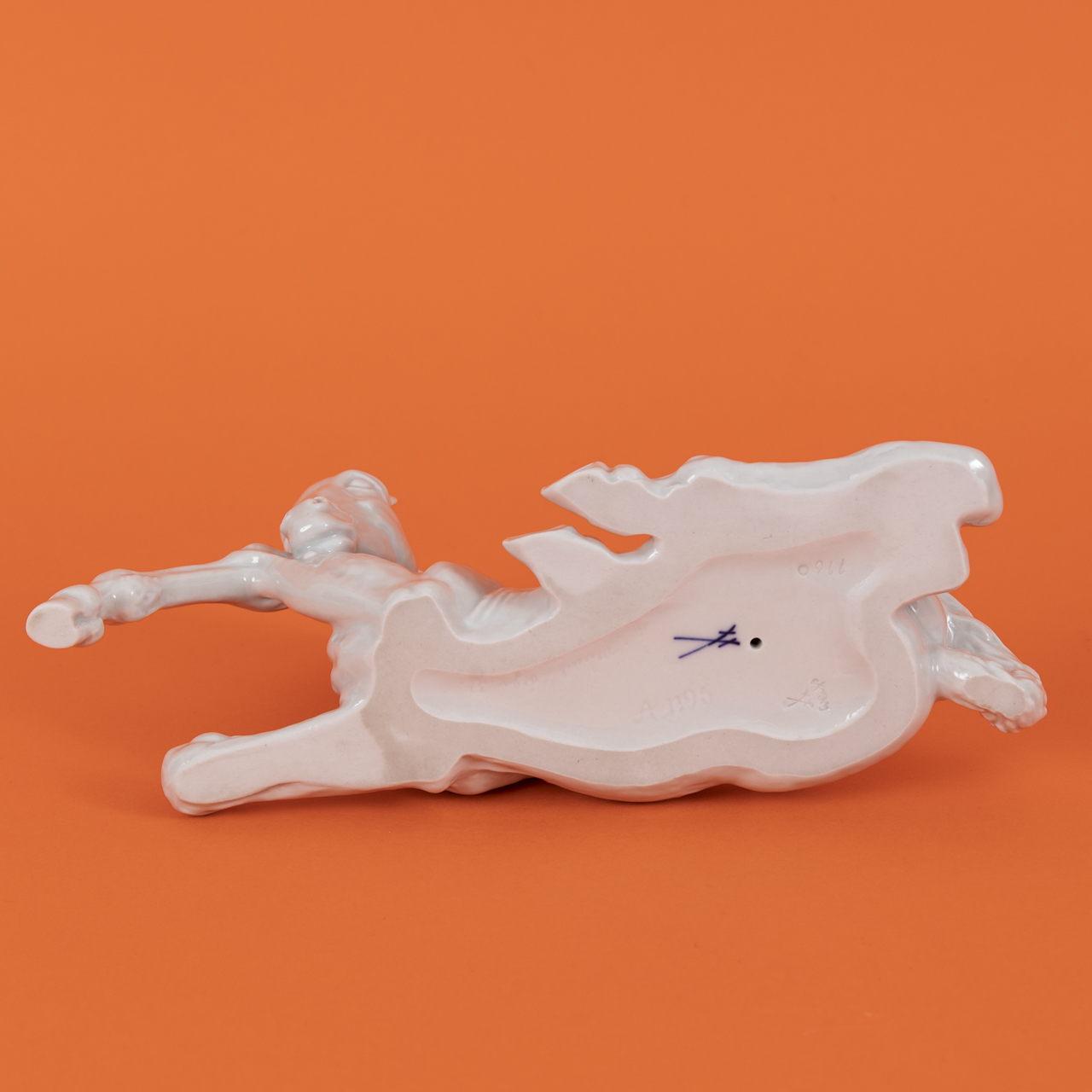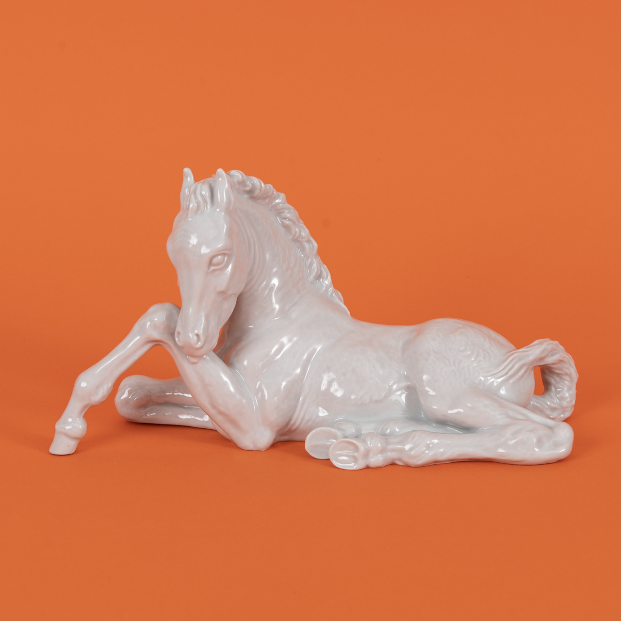 Weißporzellan glasiert; Tierplastik eines liegenden Fohlens; unterseitig unter Glasur blaue Schwertermarke mit blindgeprägten Beizeichen und Nummerierungen sowie eingeritztem Namen des Künstlers und Entstehungsjahr; Maße: ca. 12,5 x 22,8 x 8,6 cm; Gewicht: ca. 492 g.
