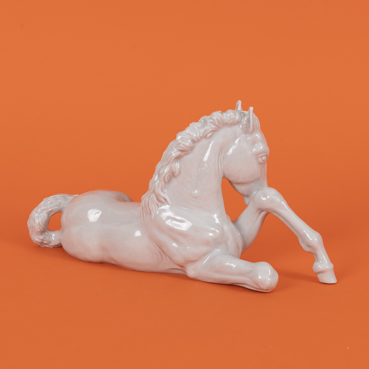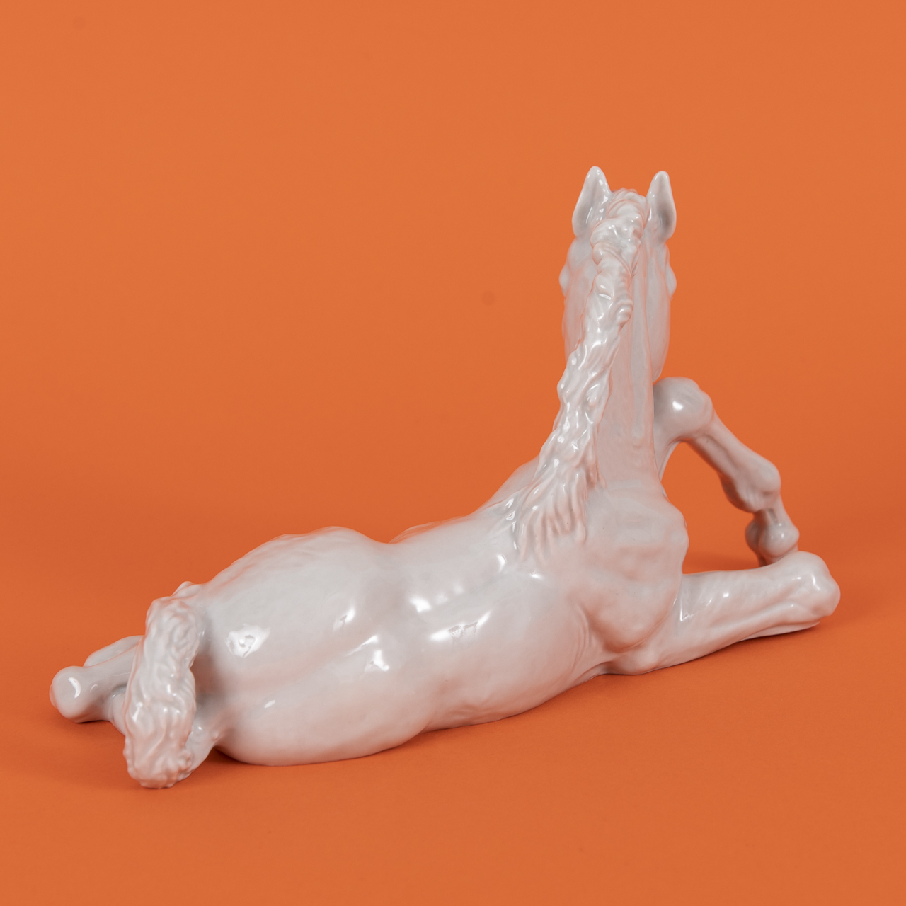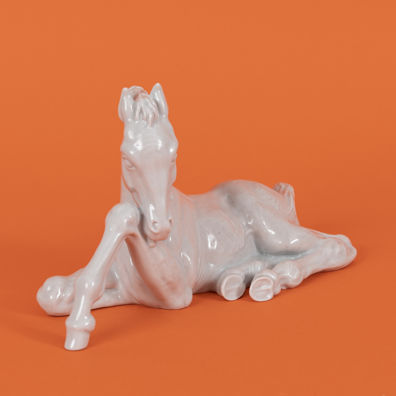 Weißporzellan glasiert; Tierplastik eines liegenden Fohlens; unterseitig unter Glasur blaue Schwertermarke mit blindgeprägten Beizeichen und Nummerierungen sowie eingeritztem Namen des Künstlers und Entstehungsjahr; Maße: ca. 12,5 x 22,8 x 8,6 cm; Gewicht: ca. 492 g.
