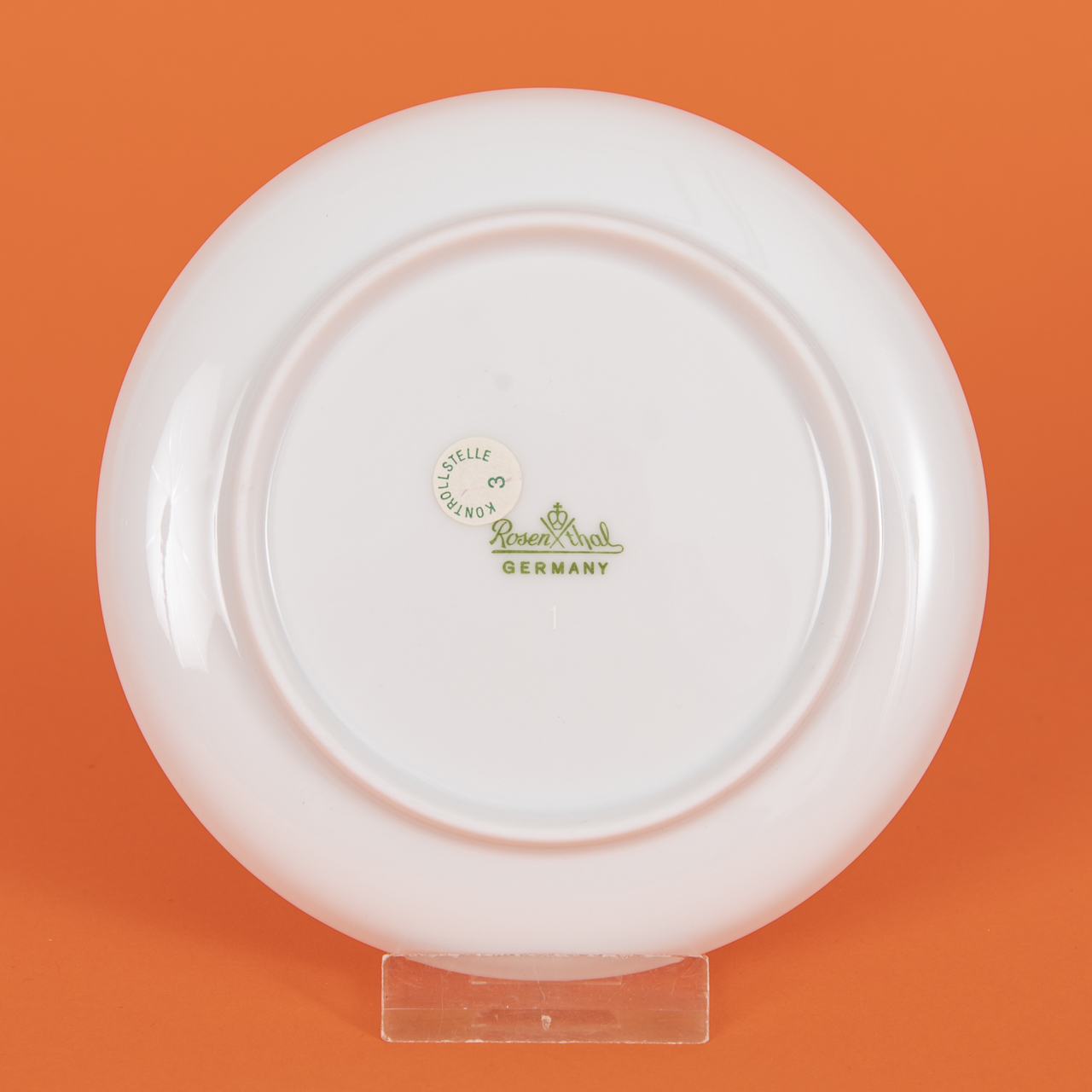 Weißporzellan mit polychromer Malerei und Goldstaffage; zwei Sammelteller mit polychromer floraler Unterglasurmalerei und überglasurvergoldeter, signierter Ausführung; eine Darstellung einer Mandoline spielenden Frau in orientalischer Kleidung und eine Darstellung einer Mandoline vor Floraldekor; Teller wurden als Teil einer Spezialedition „Concertina“ für die Brauerei Warsteiner 1996 herausgegeben; im originalen Karton von Rosenthal; unterseitig überglasur mit Firmenmarke, Modellnummer und Klebeetikett der jeweiligen Kontrollstelle versehen; Durchmesser: ca. 11,4 cm; Gesamtgewicht: ca. 176 g.