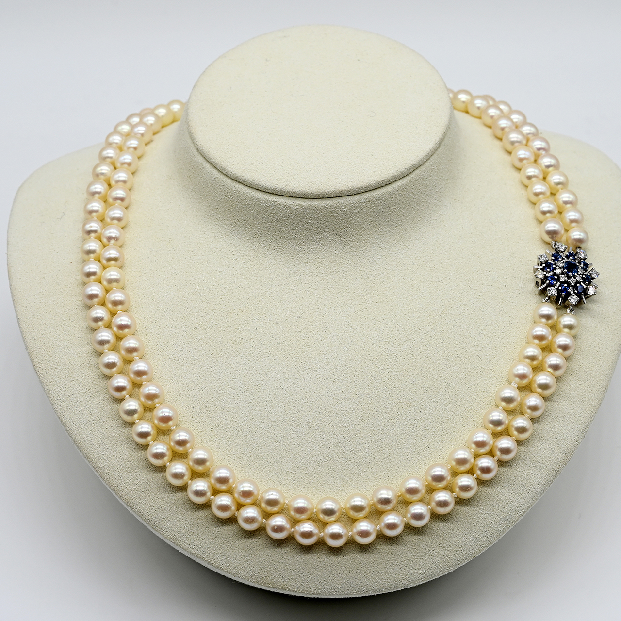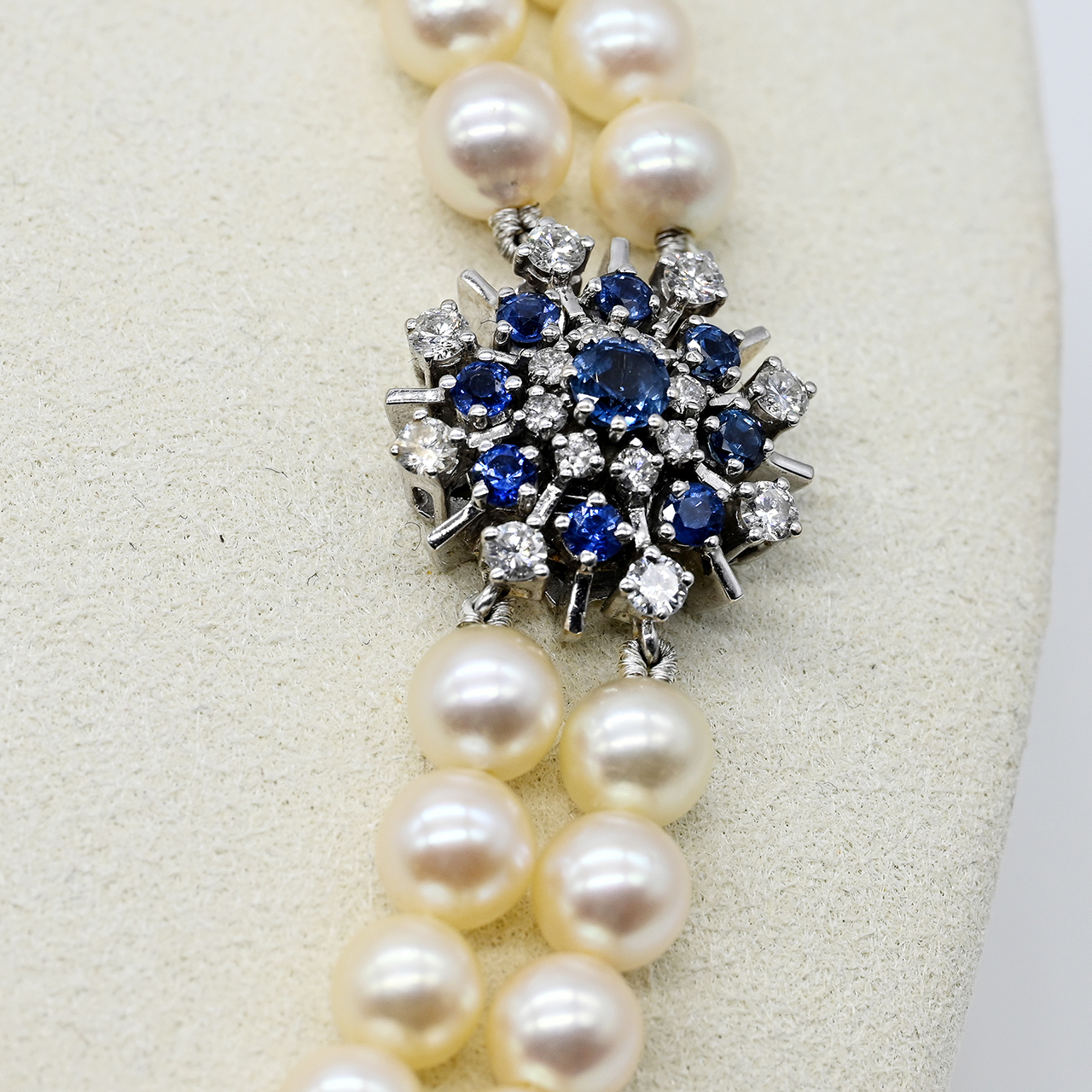 2-rhg. Akoya-Perlenkette mit Schloss mit 9 hochfeinen Saphiren und 16 Brillanten, zus. ca. 0,7 ct, Juwelierarbeit, 80er Jahre