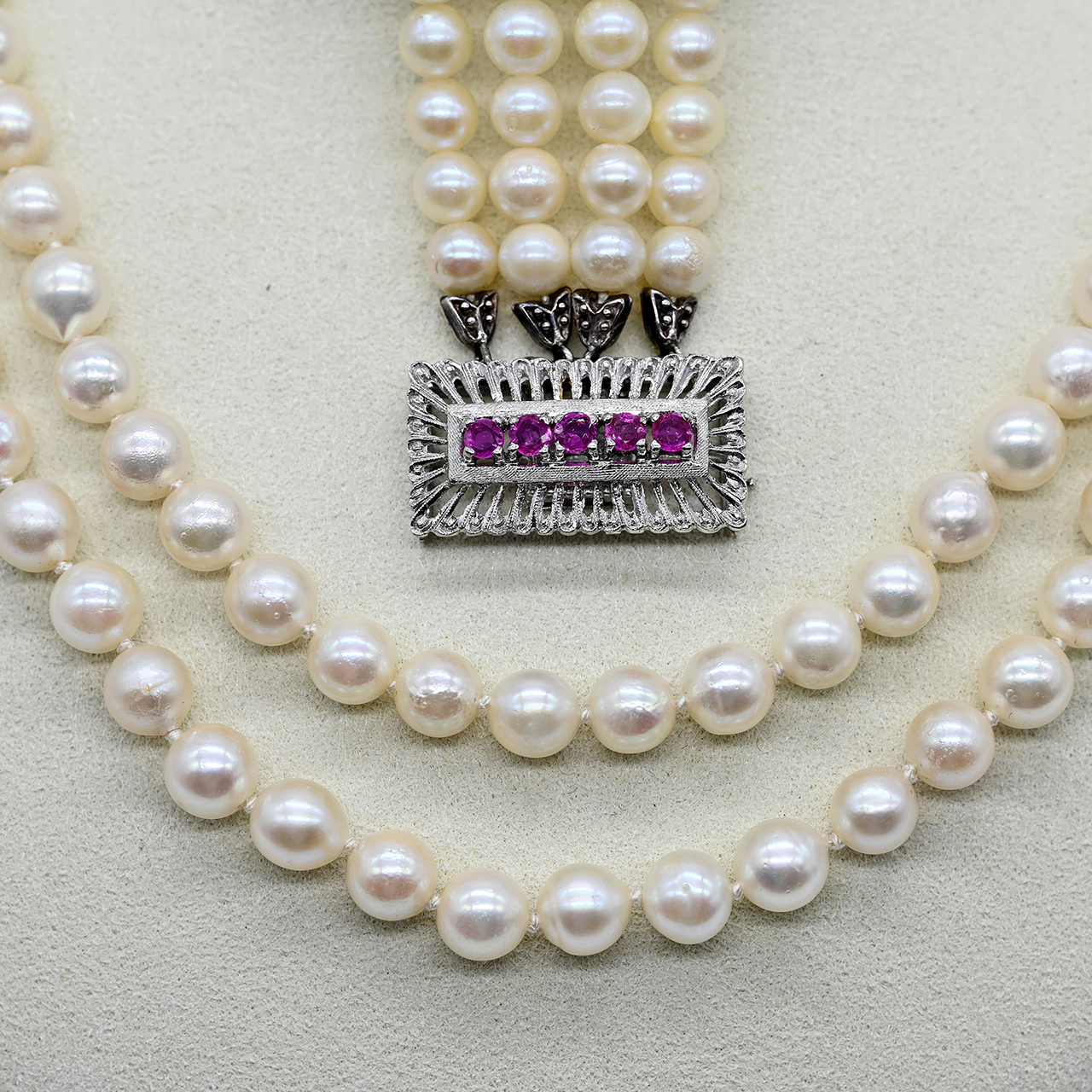 Akoya-Perlenarmband, 4-rhg., in champagner- und grünroséfarben mit unterschiedlichem Lüster; z. T. mit natürlichen Oberflächenmerkmalen; Durchmesser: ca. 5,8 mm; weißgoldenes 750/- Kastenschloss mit durchbrochenem Muster und 5 gefassten, runden, facettierten Rubinen; Maße: ca. 25 x 13,6 mm; Gesamtlänge: ca. 19 cm.