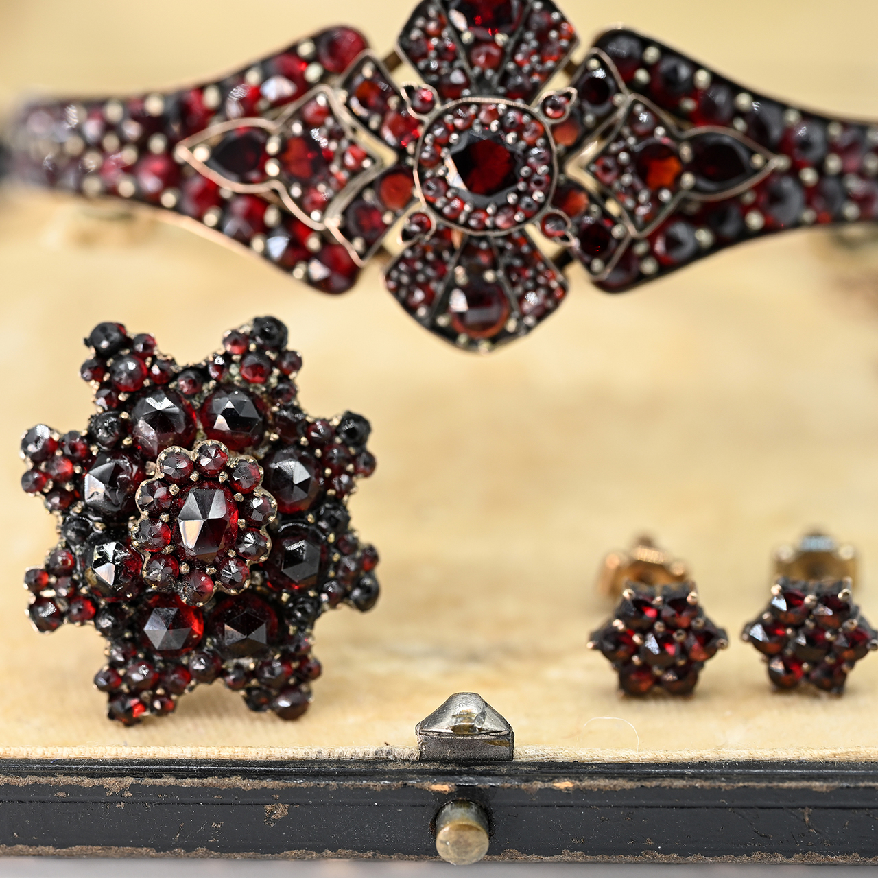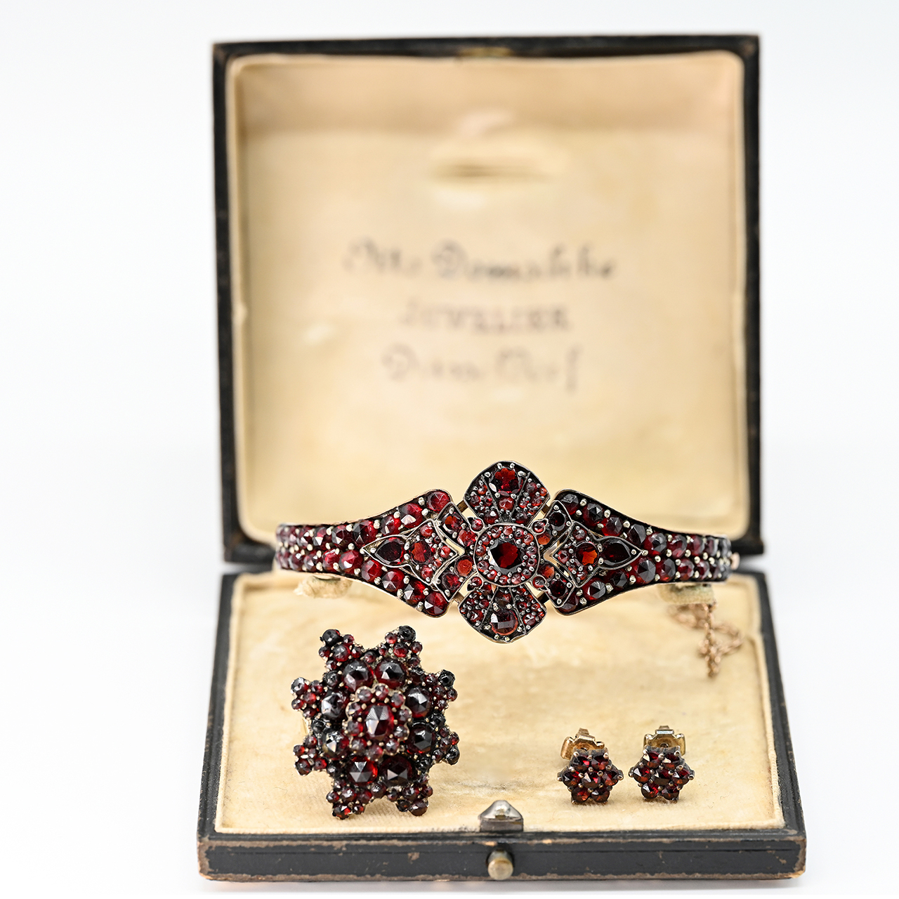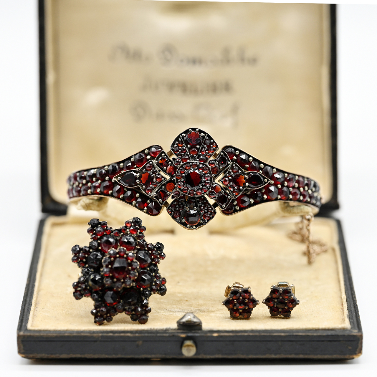 3-tlg. Schmuckgarnitur mit Granatsteinbesatz, um 1900
