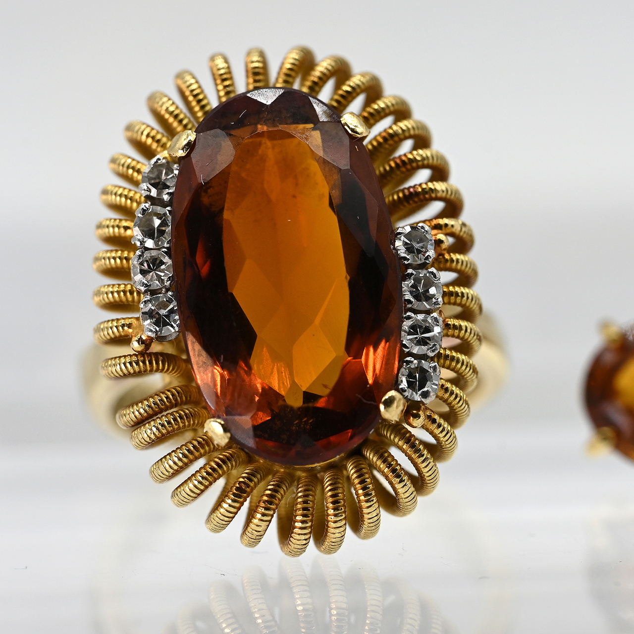 3-piece jewellery set: ring, earrings and pendant with citrine and partly brilliant-cut diamonds, goldsmith’s work, 1970s