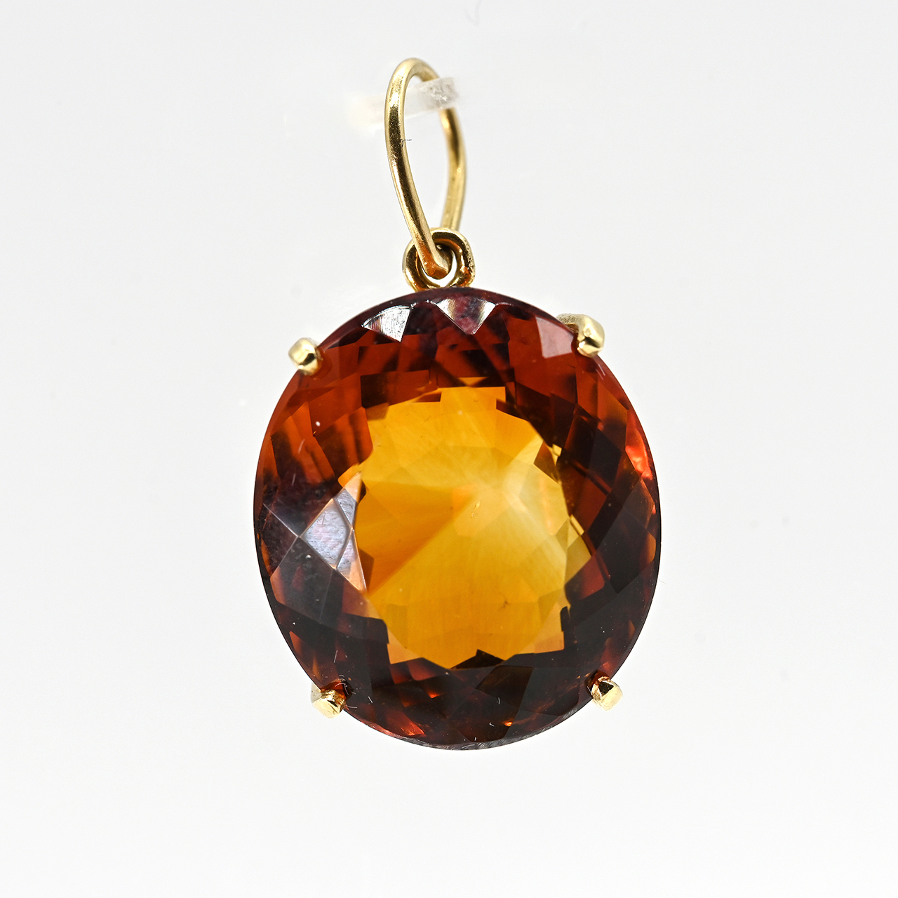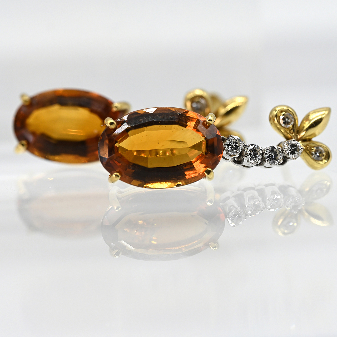 1.) Ring: 750/- yellow gold and 950/- platinum; total weight: approx. 14.3 g; high oval faceted citrine in cognac colour variety; dimensions: approx. 18.7 x 10.8 x 6.9 mm; each side diagonally set with four brilliant-cut diamonds, totalling approx. 0.27 ct; colour: G-H; clarity: VSI-SI; spiral-shaped wide bezel rim, narrow shoulder and plain tongue shank; dimensions of ring head: approx. 25.3 x 18.8 mm; height: approx. 10.7 mm; ring size: 58.5; small chip on a side facet edge. 2.) Pendant: 585/- yellow gold; total weight: approx. 5.5 g; oval faceted citrine in cognac colour variety; dimensions: approx. 19.3 x 16.8 x 10 mm; vertically set in a four-prong round wire mount; dimensions: approx. 19.3 x 16.8 mm; length incl. bail: approx. 27.6 mm. 3.) Earrings: 585/- yellow and white gold; total weight: approx. 5.6 g; stylised elongated drop shape, articulated; each earring set with six brilliant-cut diamonds, totalling approx. 0.3 ct; colour: E-G; clarity: VSI-SI; suspended faceted high oval citrine in cognac colour variety; dimensions: 13.6/13.4 x 9/8.6 x 5.1/5.5 mm; total length: approx. 28.8 mm; one screw back missing and one post bent.