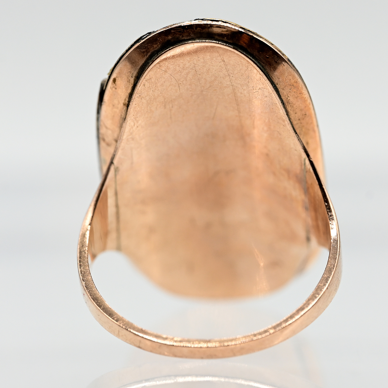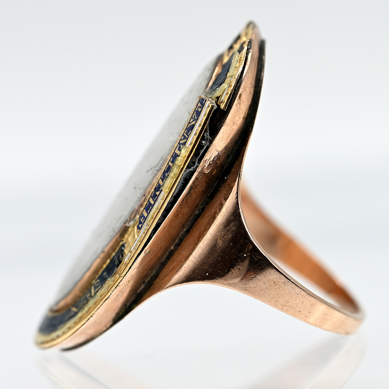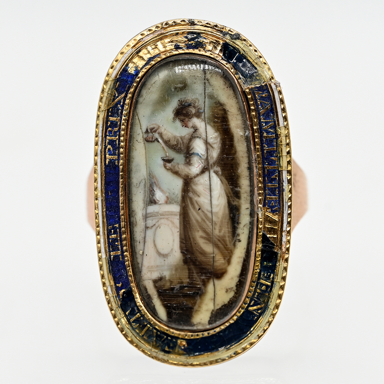585/- rose gold; total weight: approx. 5.9 g; elongated high oval form; side view of a young lady standing by a fountain; fine glazed miniature painting; surrounding bezel edge with motto outlined in blue enamel; heavily damaged and only faintly, fragmentarily discernible; pronounced age-related wear and losses; dimensions of ring head: approx. 31.3 x 17.9 mm; ring size: 57.5.