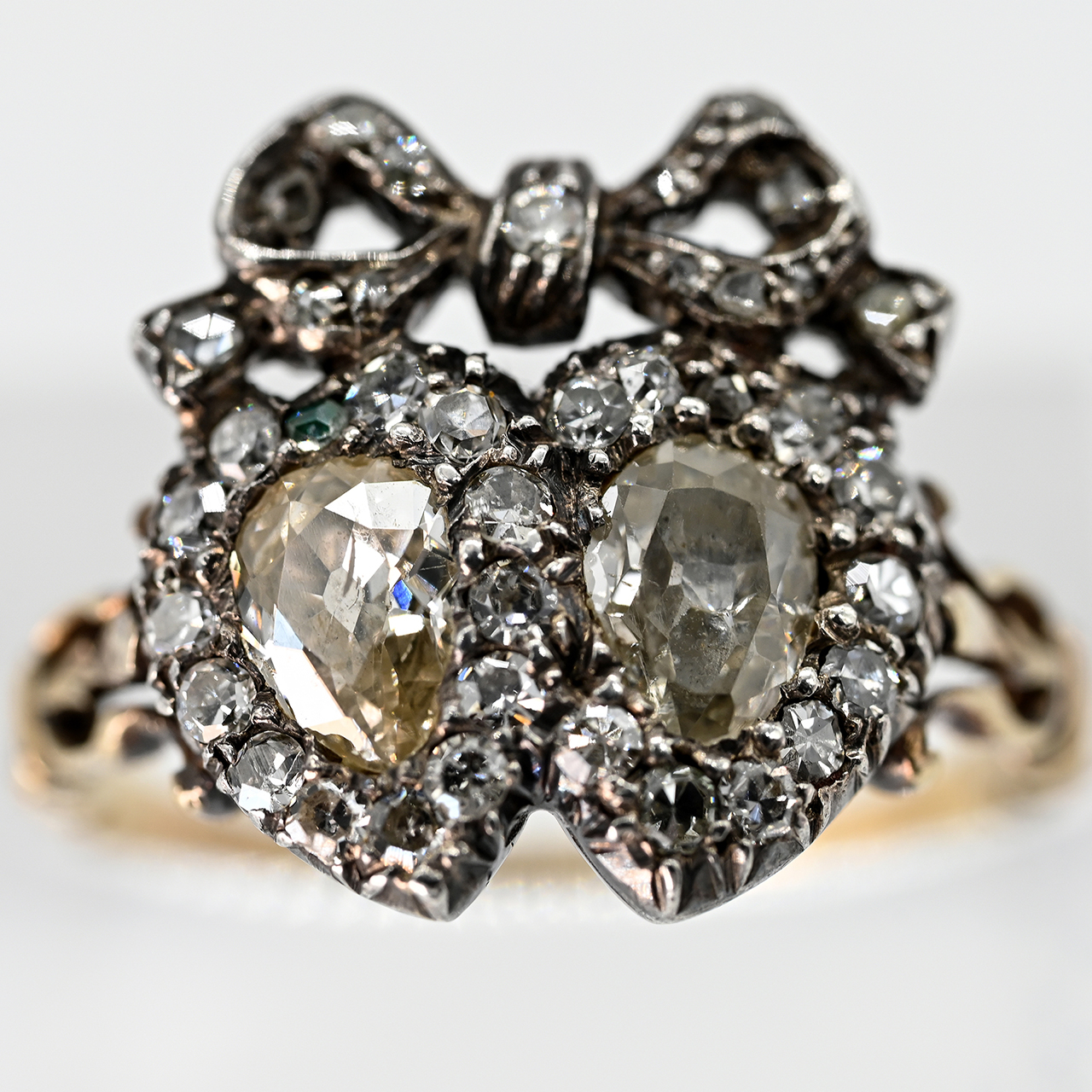 18 kt yellow gold and silver; total weight: approx. 6 g; arranged in the English cluster style, two stylised hearts topped with a bow motif; richly set with diamonds; two pear-cut diamonds; colour: N-Z or fancy, shading into champagne tones; external measurements: approx. 6.3 x 4.5 mm and 6.1 x 4.5 mm; 36 old-cut diamonds, totalling approx. 0.38 ct; colour: G-L; clarity: in the medium range; ornately openworked and decorated gold shank; very slight wear consistent with age and use; dimensions of ring head: approx. 16.6 x 15.7 mm; height: approx. 4.7 mm; ring size: 52.5.