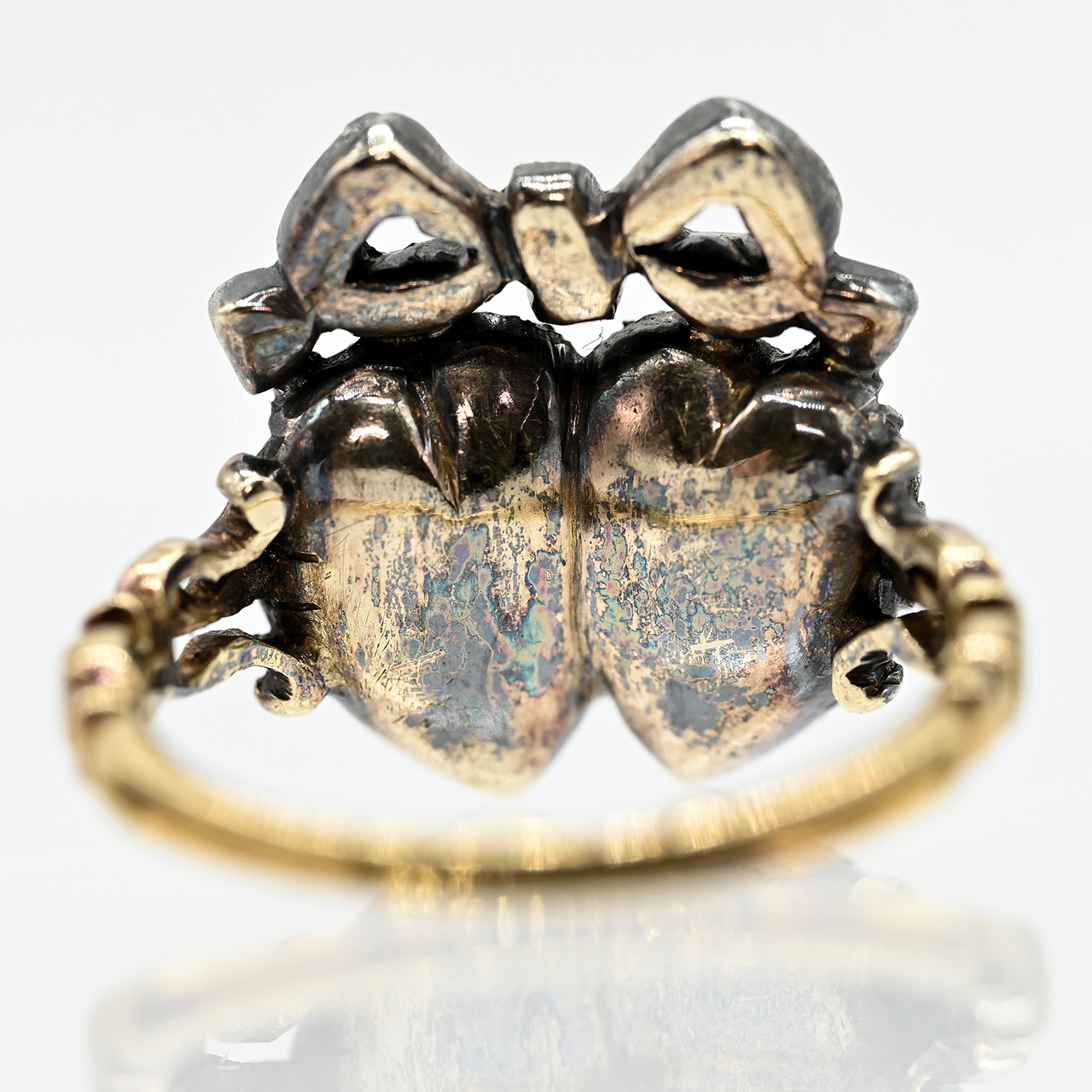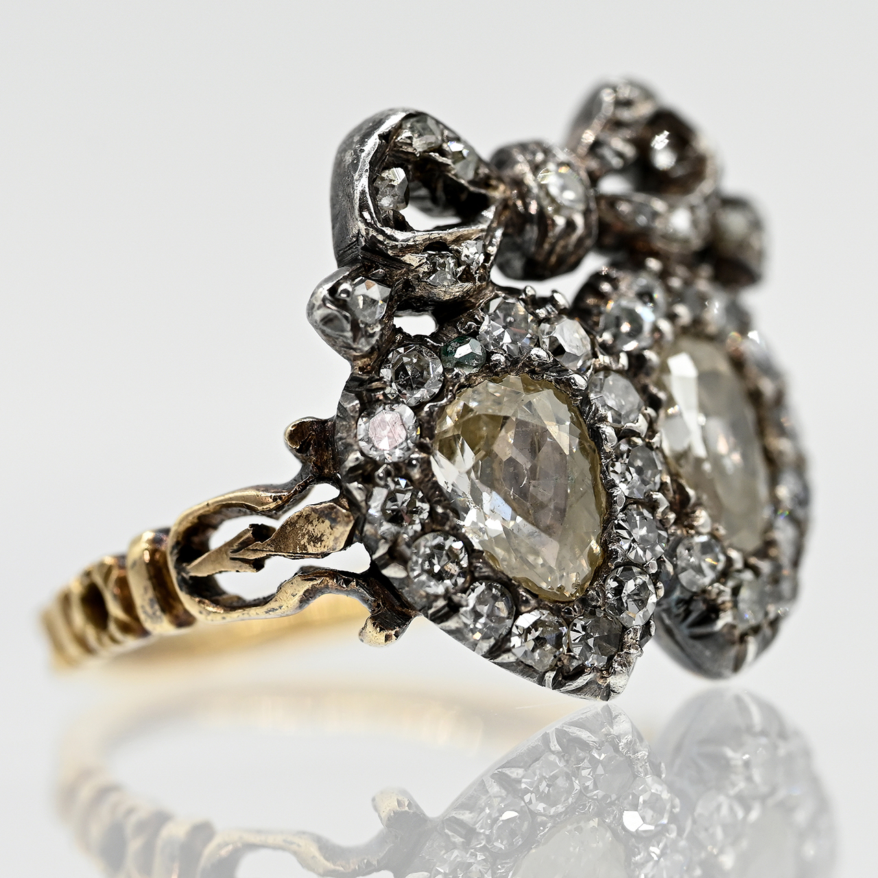 18 kt Gelbgold und Silber; Gesamtgewicht: ca. 6 g; im englischen Cluster-Stil angeordnet, zwei stilisierte Herzen mit Schleifenbekrönung; reich mit Diamanten ausgefasst; zwei Diamanten im Tropfenschliff; Farbe: N-Z bzw. Fancy, in champagnerfarben übergehend; äußere Maße: ca. 6,3 x 4,5 mm und 6,1 x 4,5 mm; 36 Altschliff-Diamanten, zus. ca. 0,38 ct; Farbe: G-L; Reinheit: im mittleren Bereich; ornamental durchbrochene und verzierte goldene Ringschiene; sehr leichte Abnutzung, dem Alter und der Nutzung entsprechend; Maße der Ringmitte: ca. 16,6 x 15,7 mm; Höhe: ca. 4,7 mm; Ringgröße: 52,5.