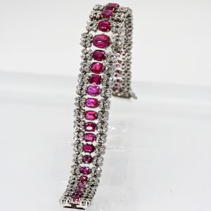 Platinum; total weight: approx. 80 g; composed of multiple articulated segments with lateral flow; centrally set with 31 rubies in various colour varieties, carat, inclusion characteristics and cut types: 1 cabochon and 30 faceted; dimensions of the stones from 4.6 x 3.7 mm to 10 x 7 mm; laterally framed by a total of 252 diamonds cut in various old cuts; colour: H-L (mid to lower range); clarity: SI-Piqué 2 (in the mid to lower range); concealed box clasp with side safety eights; dimensions of the bracelet: centre approx. 23.6 mm, sides approx. 16.6 mm; total length: approx. 20 cm; stamped on the reverse: Carl Ernst; minor signs of wear to the facet edges; various tin restorations on individual prongs; presumably a marriage assembled from several pieces of jewellery.