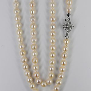 Clasp in 750/- white gold; stylised flower set with 7 small diamonds, total approx. 0.05 ct; colour and clarity: in the medium range; dimensions: approx. 20.2 x 14.9 mm; cream-coloured Akoya pearls with silvery lustre; natural surface characteristics and slightly irregular shape; diameter: approx. 7.5-8.3 mm; total length: approx. 100 cm.